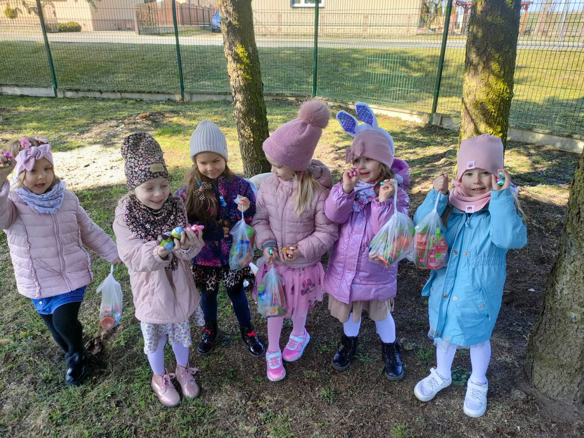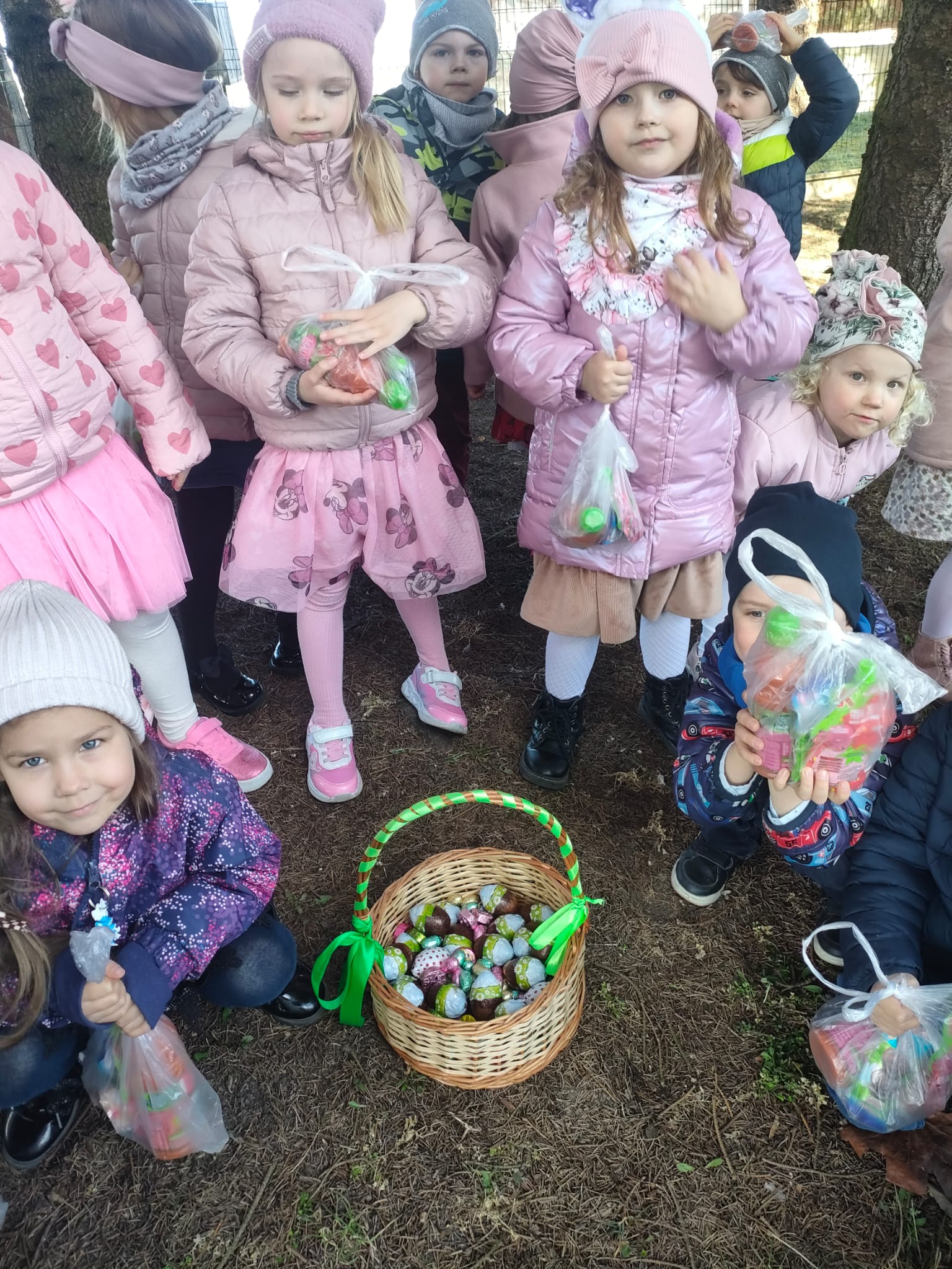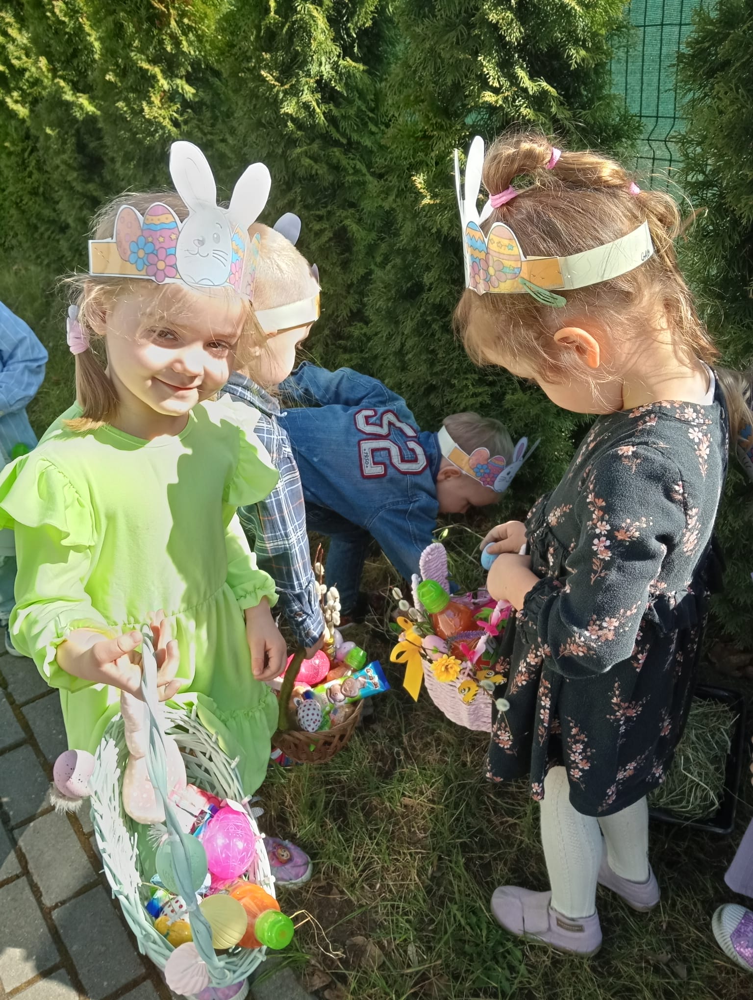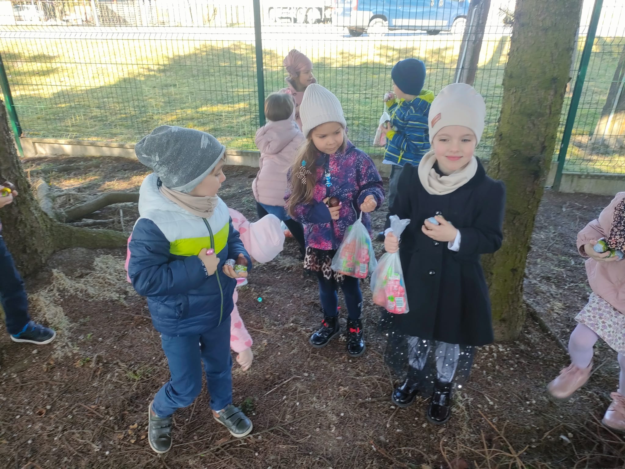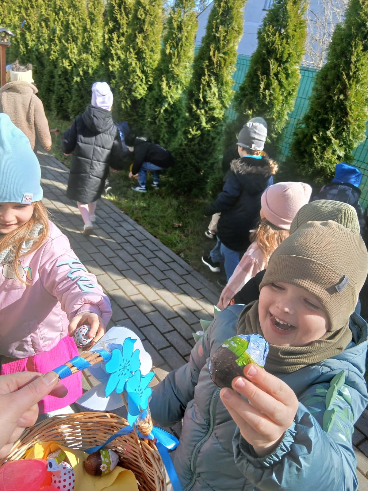Po śniadaniu na przedszkolaki czekała wyjątkowa niespodzianka – poszukiwanie jajek od Zajączka Wielkanocnego. Dzieci z ogromnym zaangażowaniem i uśmiechem na twarzach szukały ukrytych niespodzianek , co sprawiło im wiele radości i dostarczyło niezapomnianych wrażeń.