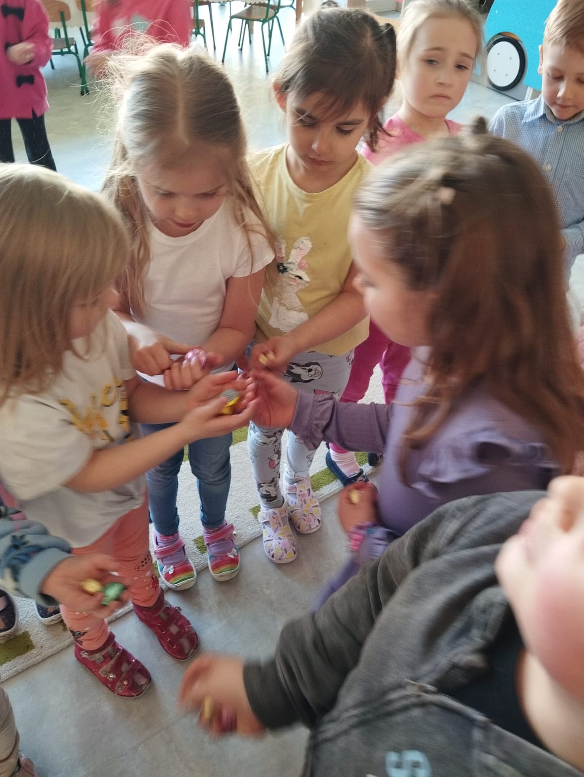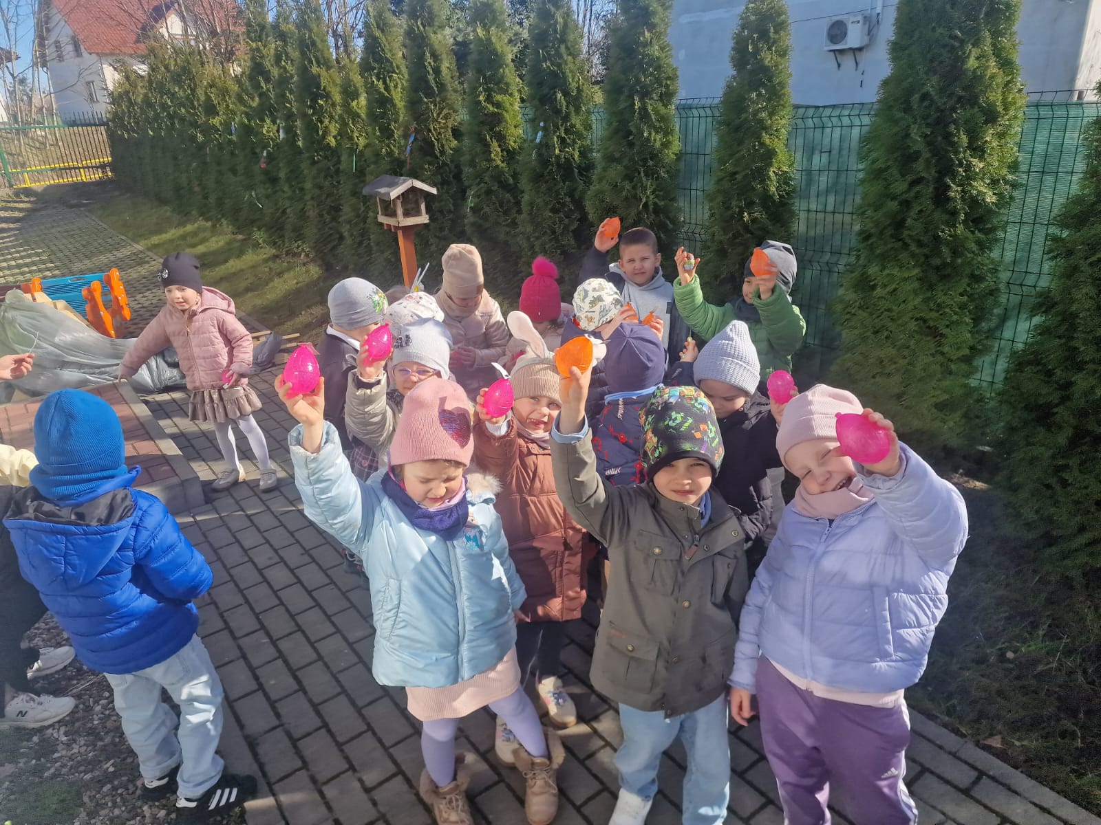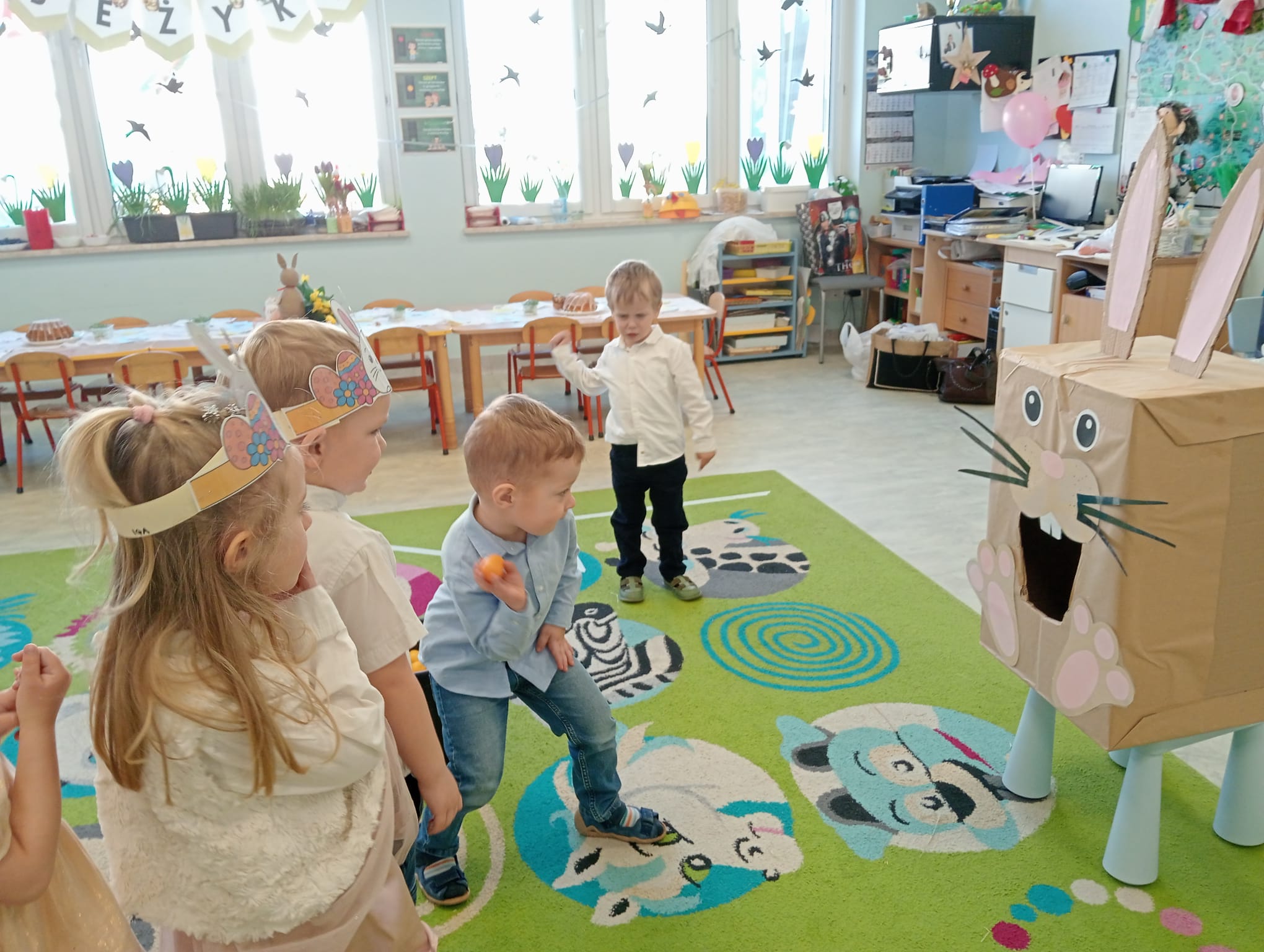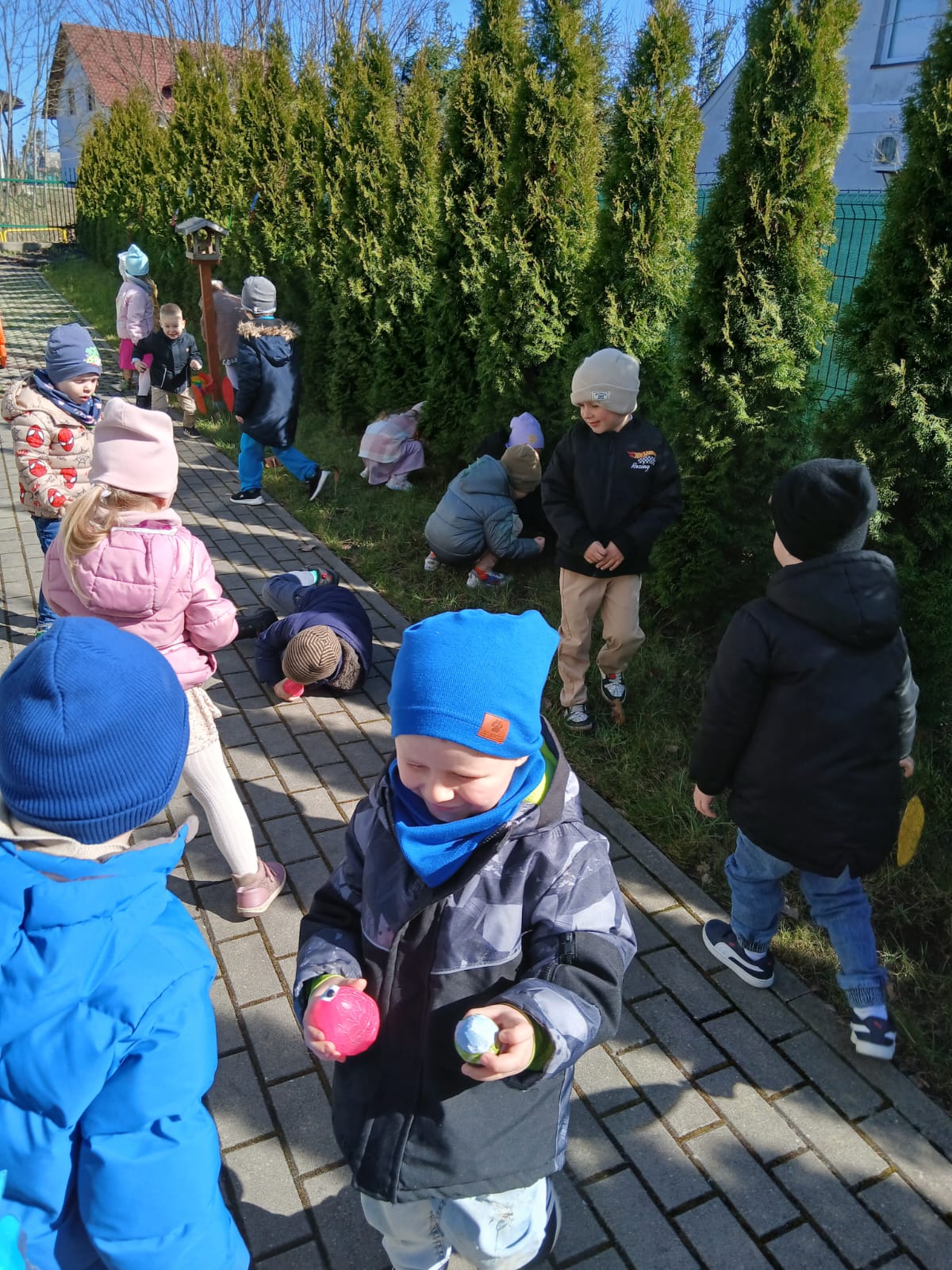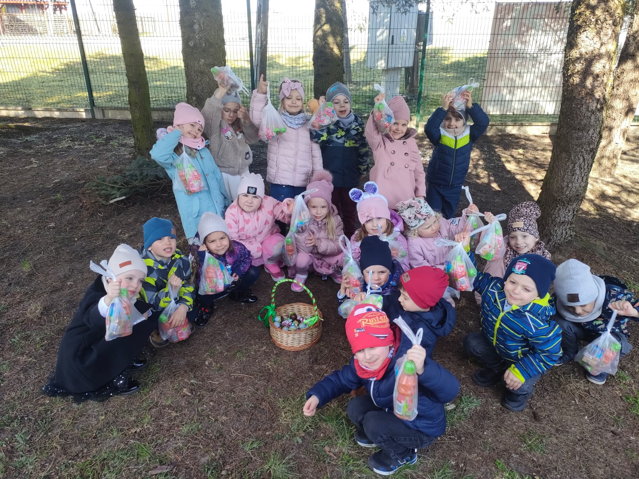 Po śniadaniu na przedszkolaki czekała wyjątkowa niespodzianka – poszukiwanie jajek od Zajączka Wielkanocnego. Dzieci z ogromnym zaangażowaniem i uśmiechem na twarzach szukały ukrytych niespodzianek , co sprawiło im wiele radości i dostarczyło niezapomnianych wrażeń.