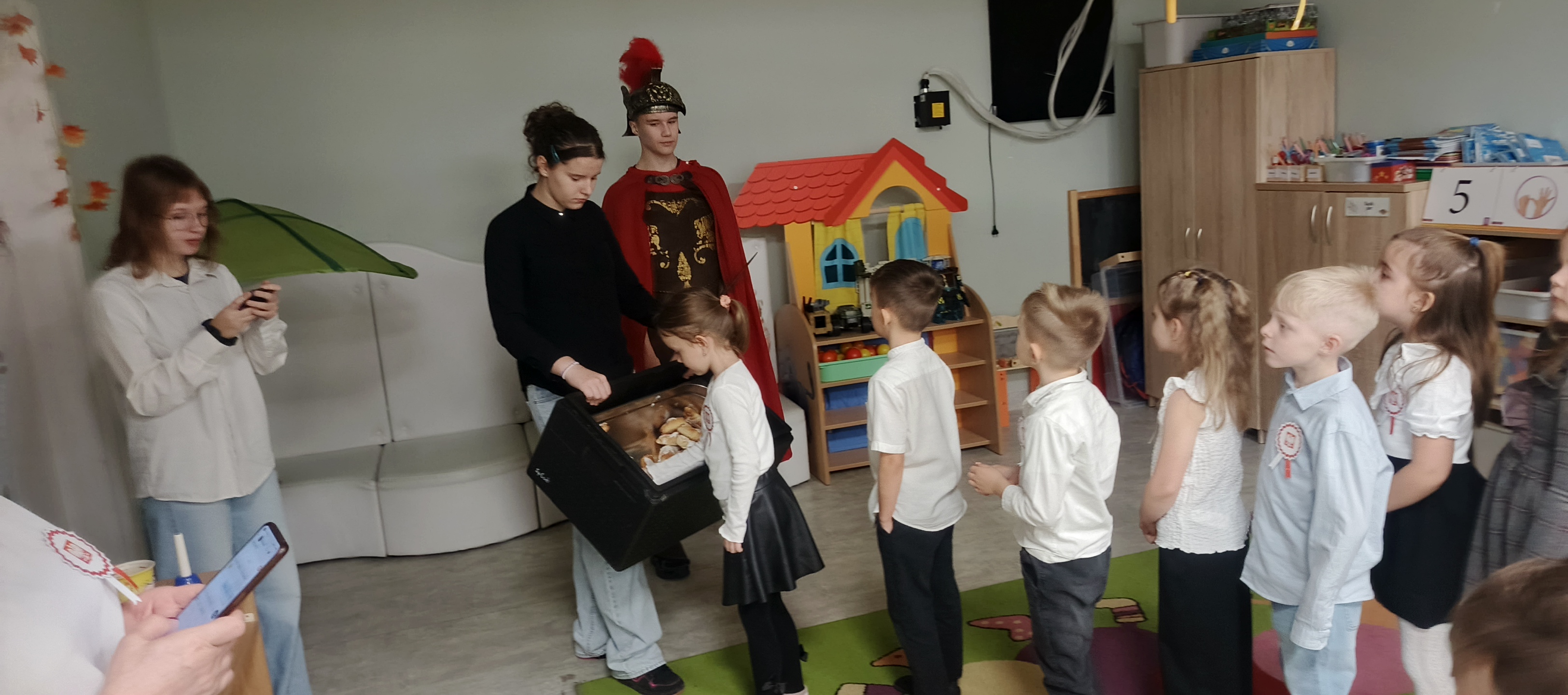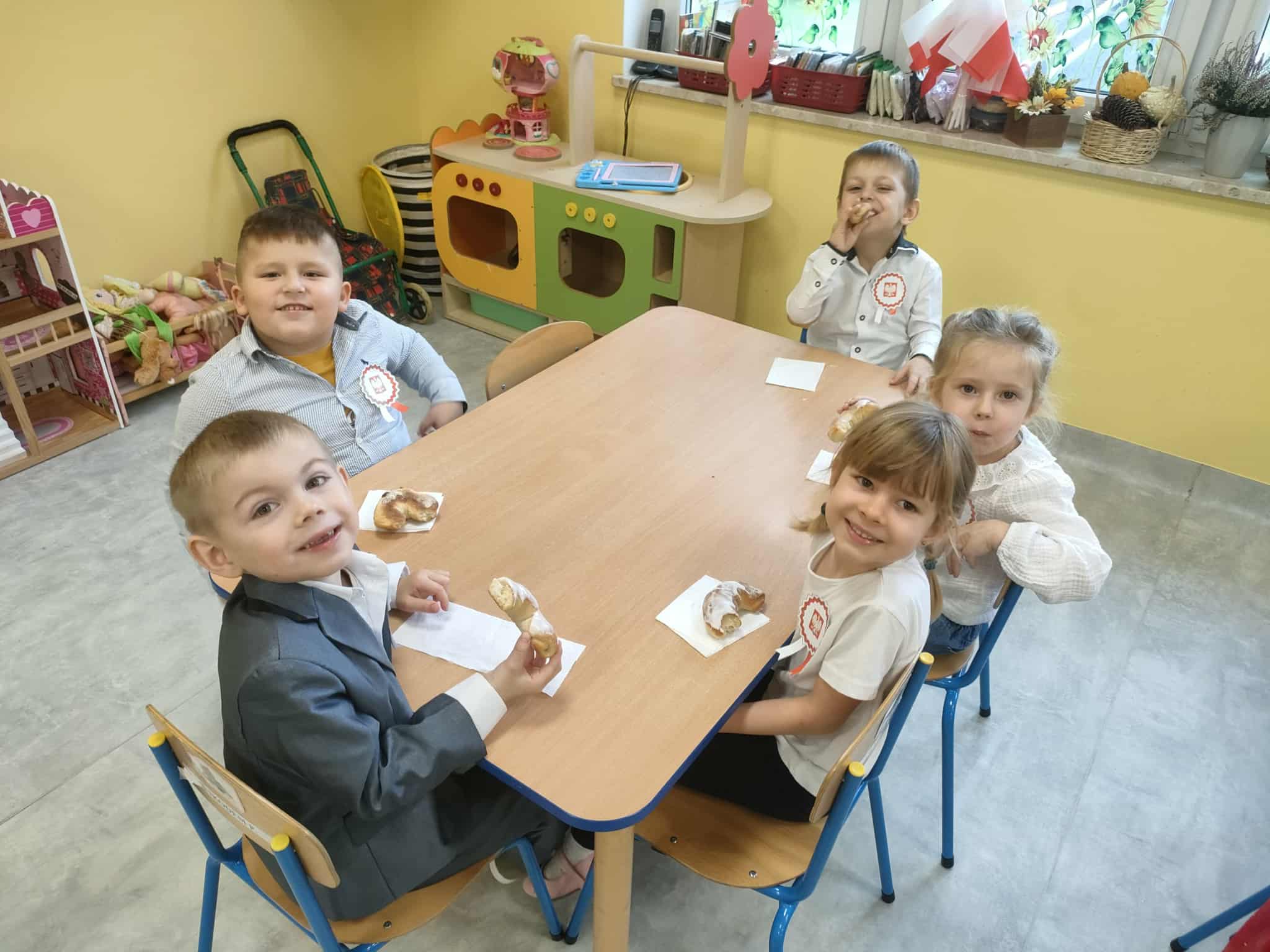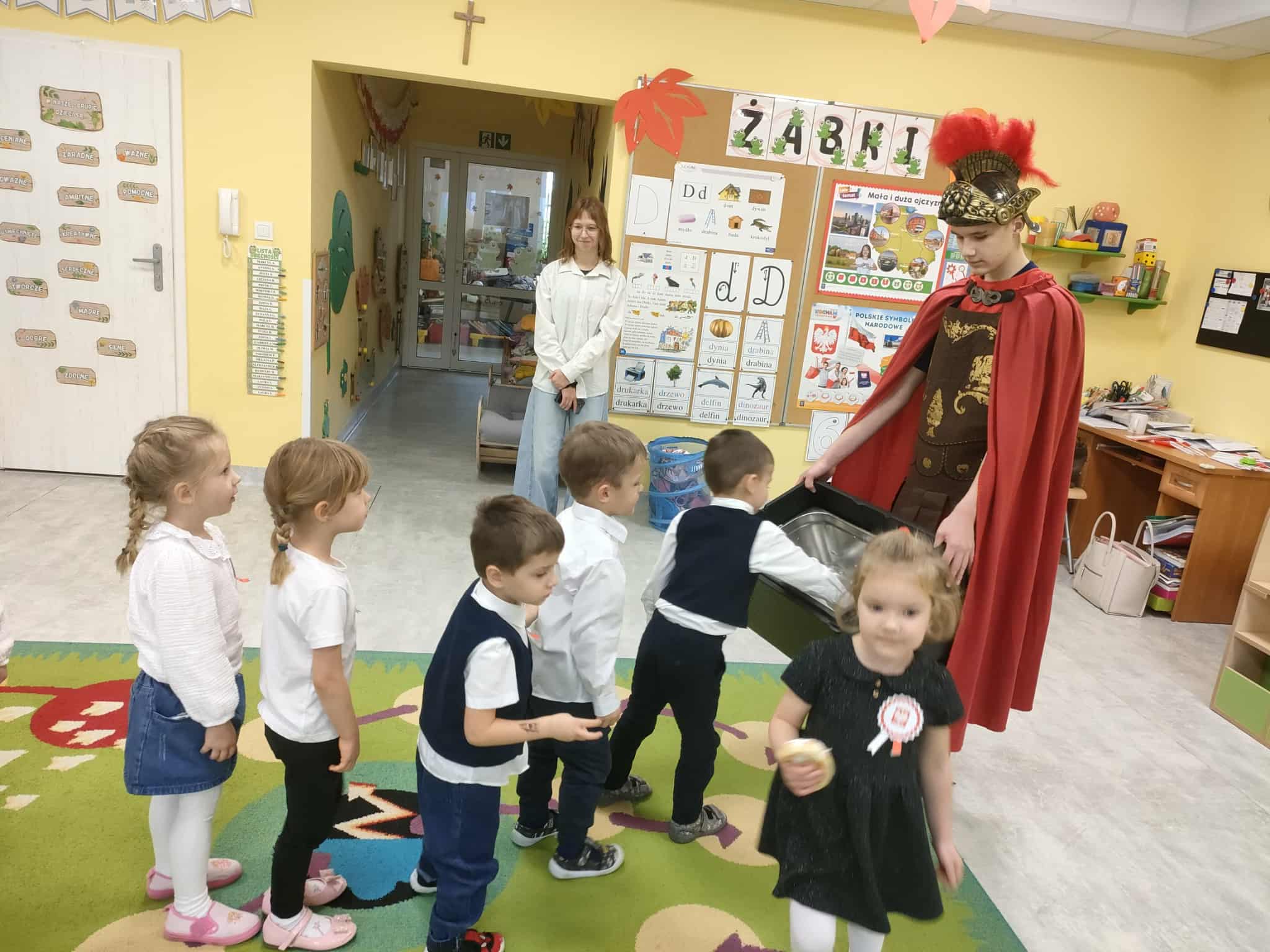 Tego dnia goÅ›ciliÅ›my w przedszkolu również wyjÄ…tkowych goÅ›ci. Po Å›niadaniu dzieci odwiedziÅ‚ ÅšwiÄ™ty Marcin, który wraz ze swymi pomocnikami przybliżyÅ‚ przedszkolakom swoja historiÄ™ i tradycyjnie poczÄ™stowaÅ‚ dzieci rogalikami.