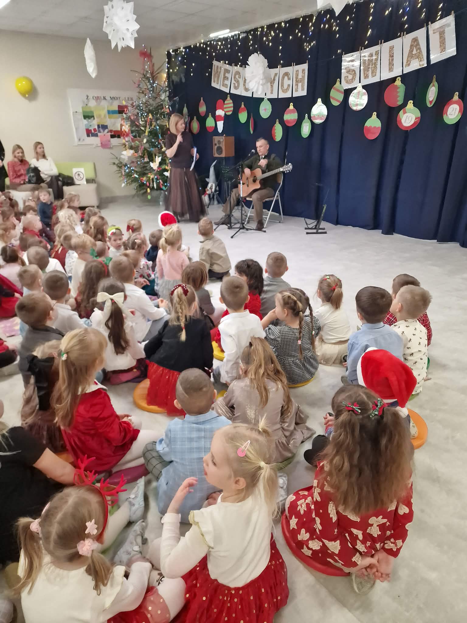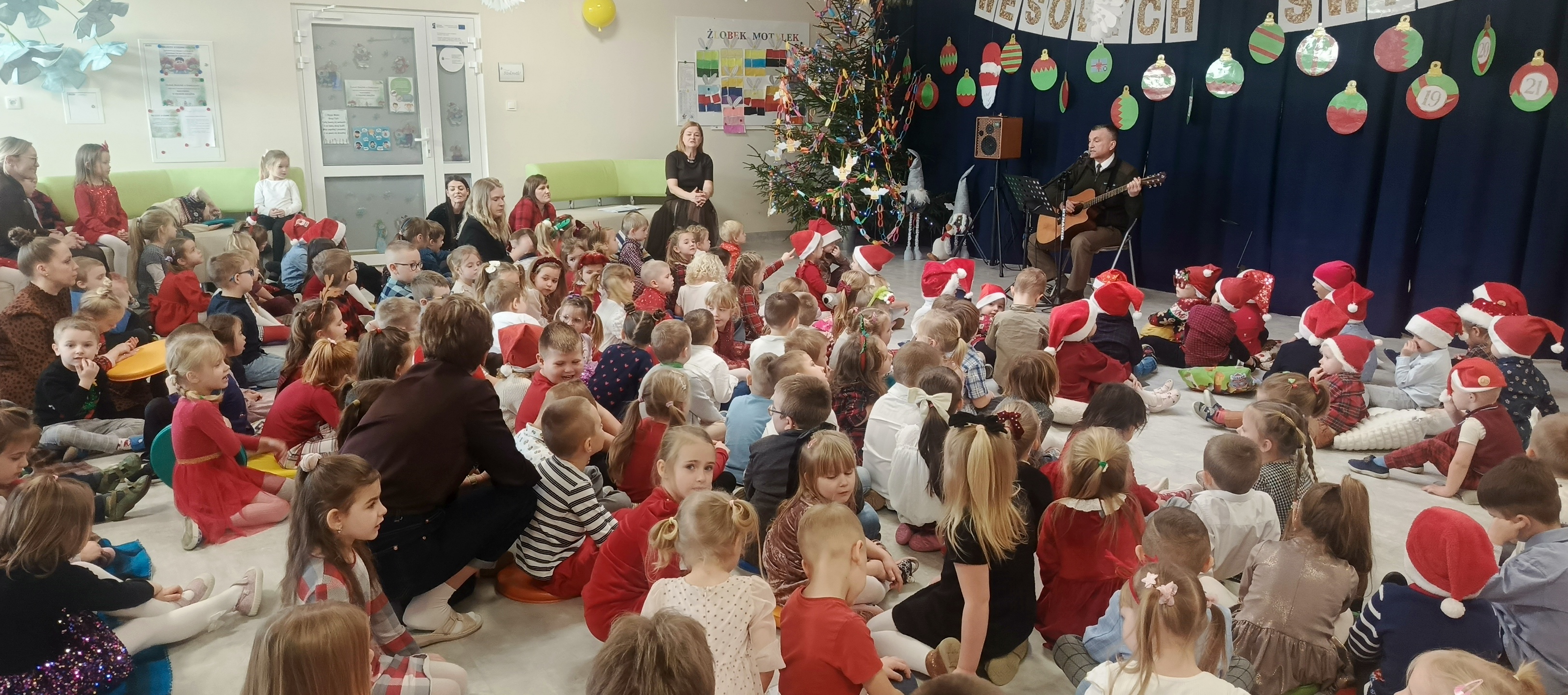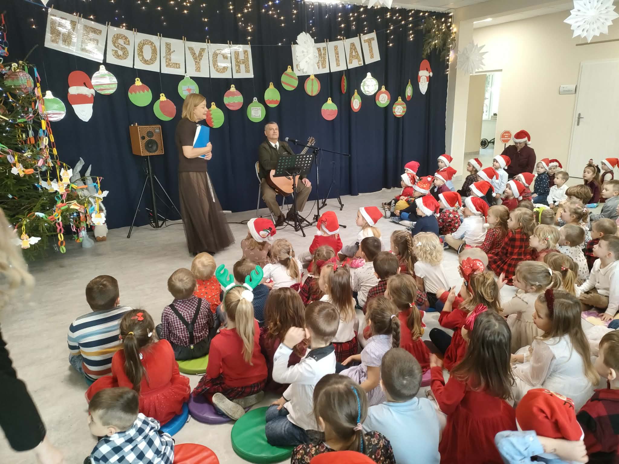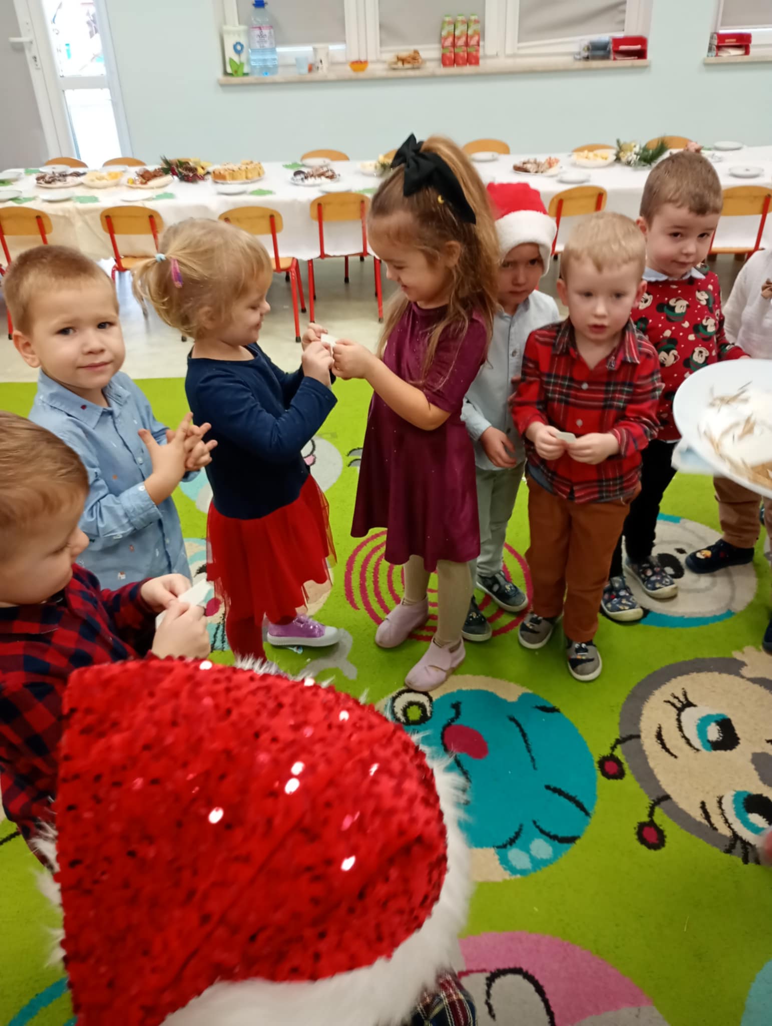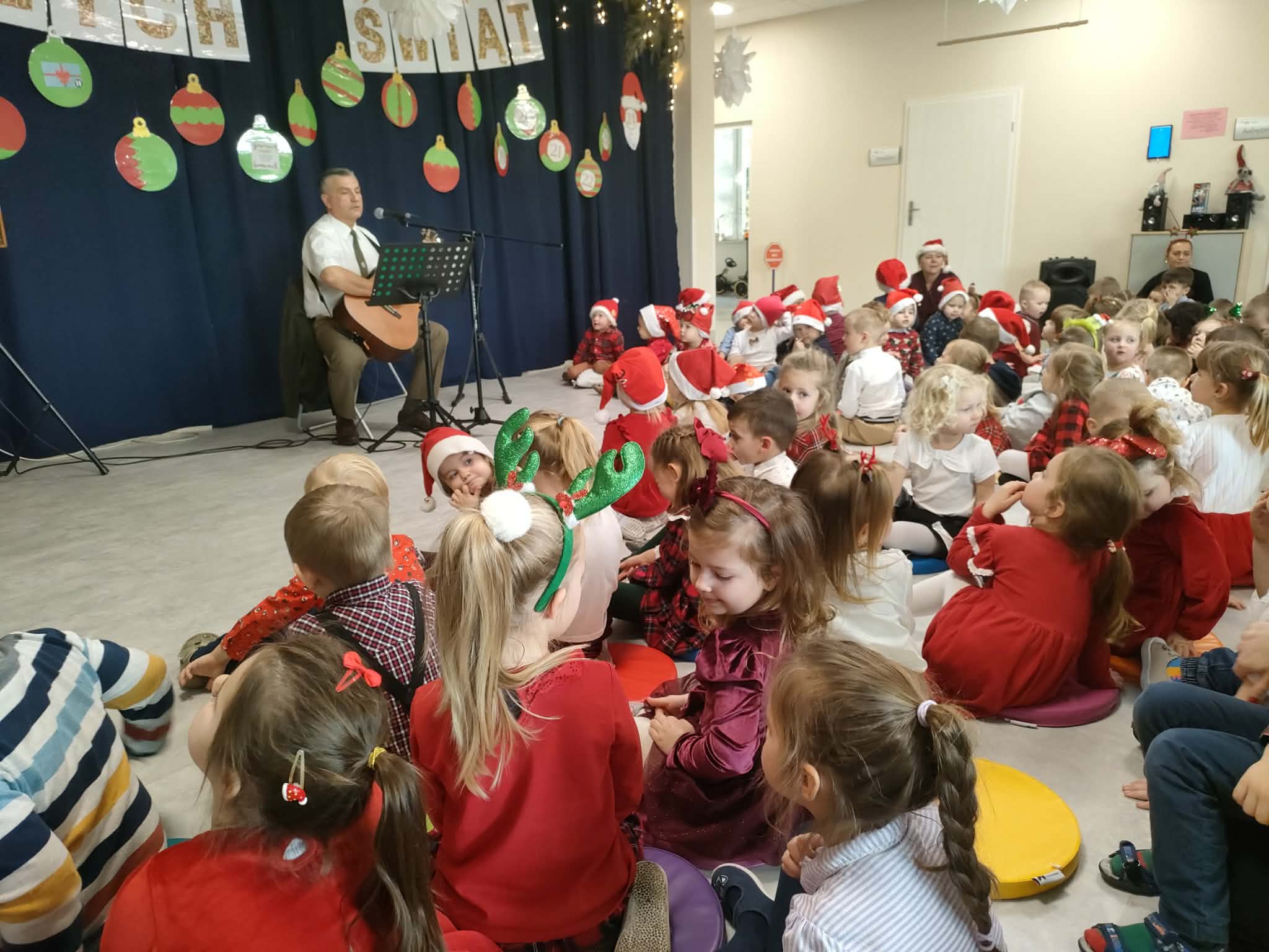 W piatek 19 grudnia naszym przedszkolu odbyła się uroczysta Wigilia przedszkolna połączona z kolędowaniem. W ciepłej, świątecznej atmosferze dzieci wspólnie dzieliły się opłatkiem i śpiewały kolędy. Wyjątkowym gościem był leśniczy Pan Adam Cymerys, który akompaniował na gitarze, wprowadzając wszystkich w radosny, bożonarodzeniowy nastrój. Był to piękny czas pełen uśmiechu, muzyki i świątecznej bliskości.