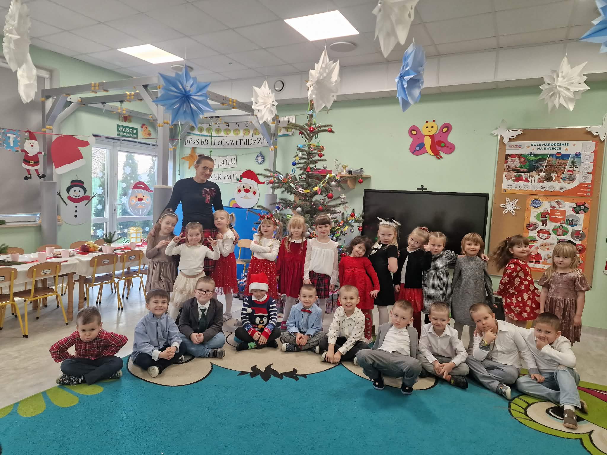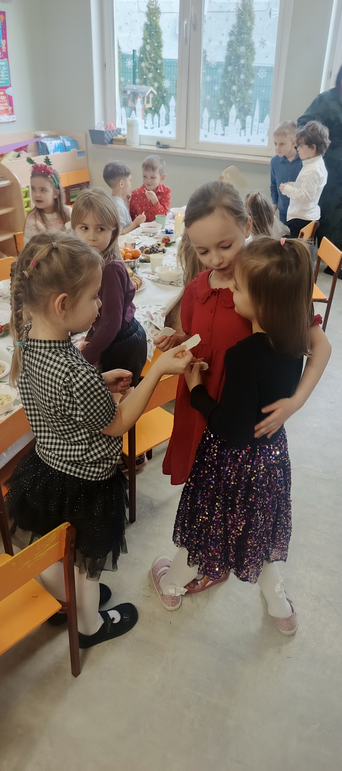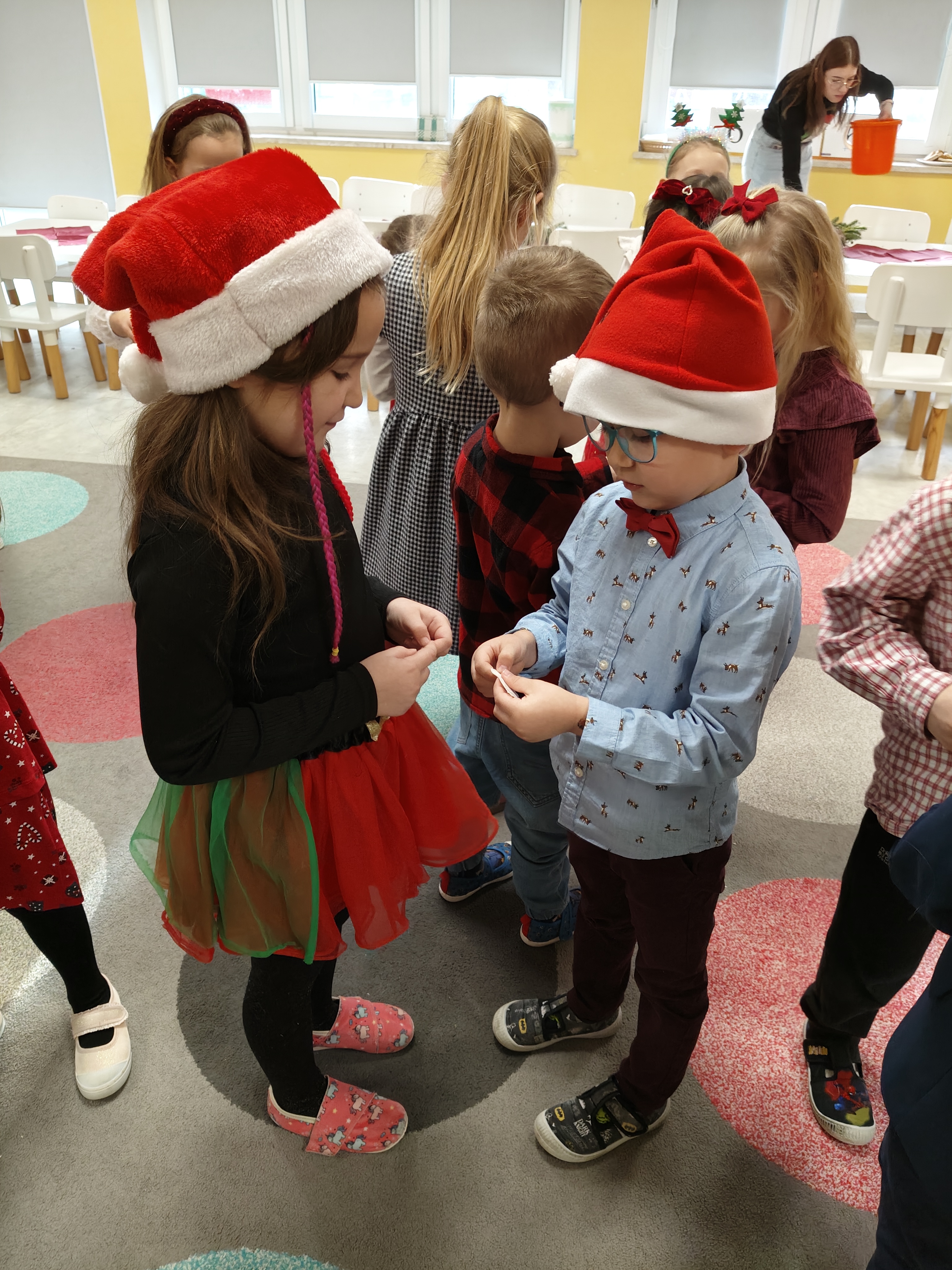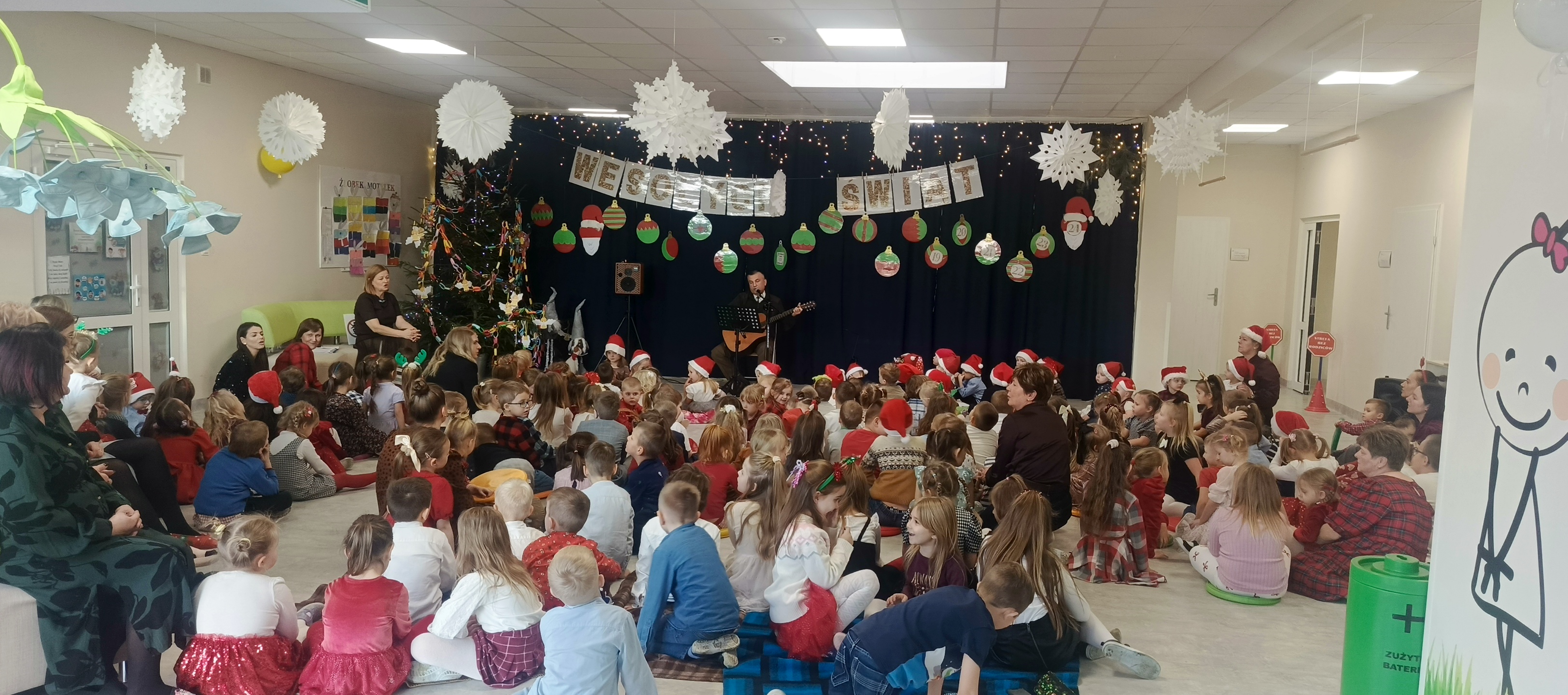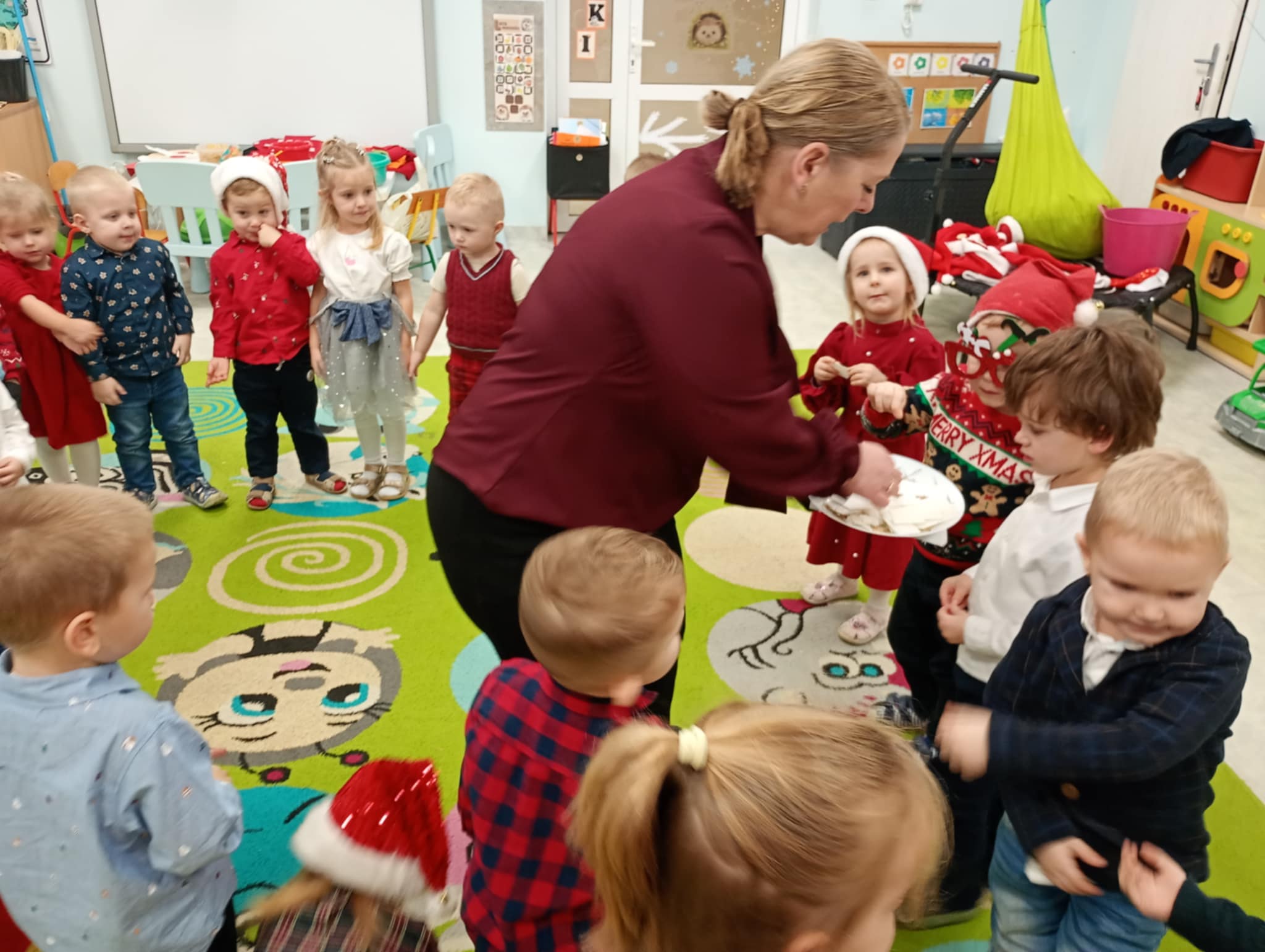 W piatek 19 grudnia naszym przedszkolu odbyła się uroczysta Wigilia przedszkolna połączona z kolędowaniem. W ciepłej, świątecznej atmosferze dzieci wspólnie dzieliły się opłatkiem i śpiewały kolędy. Wyjątkowym gościem był leśniczy Pan Adam Cymerys, który akompaniował na gitarze, wprowadzając wszystkich w radosny, bożonarodzeniowy nastrój. Był to piękny czas pełen uśmiechu, muzyki i świątecznej bliskości.