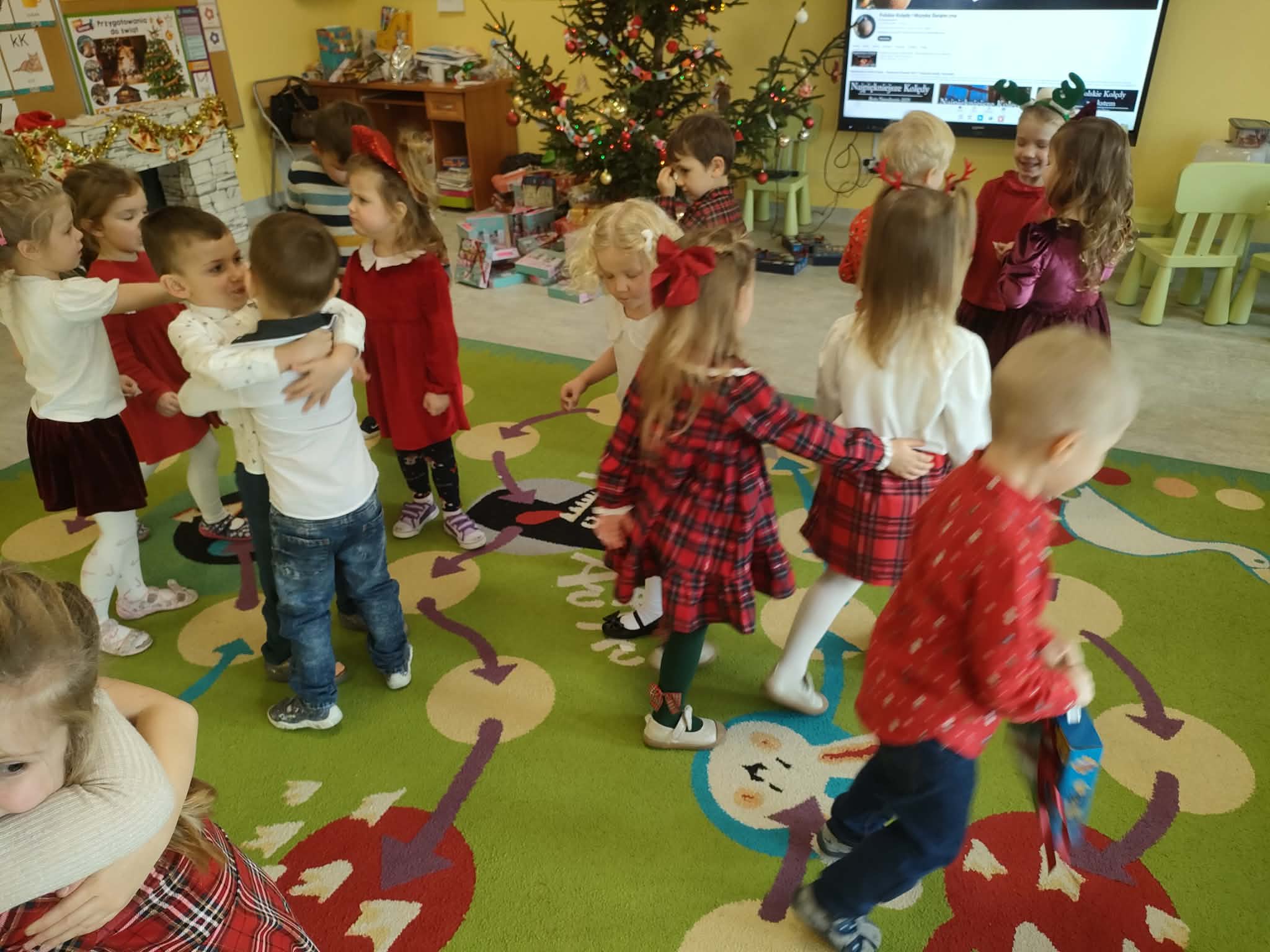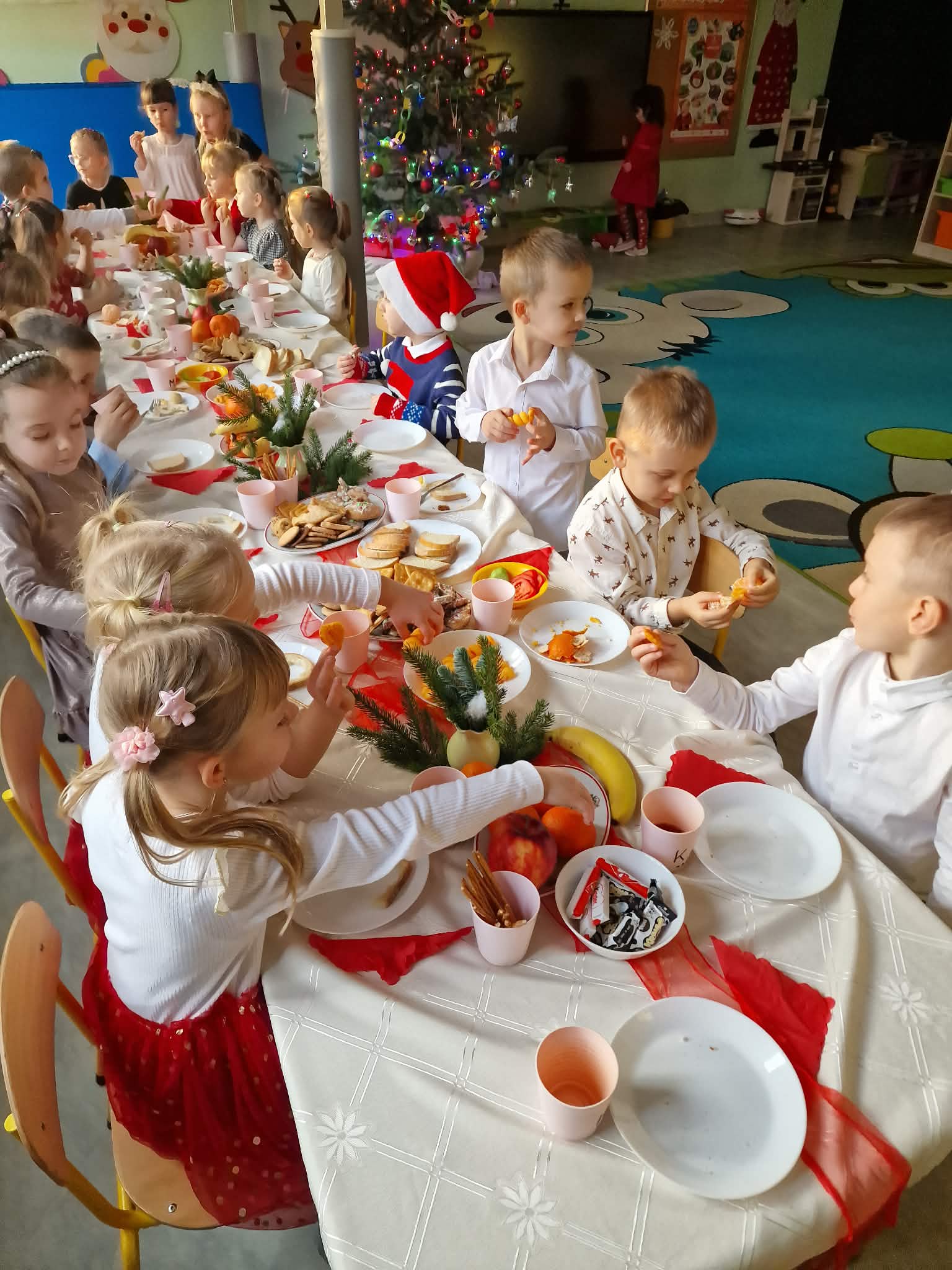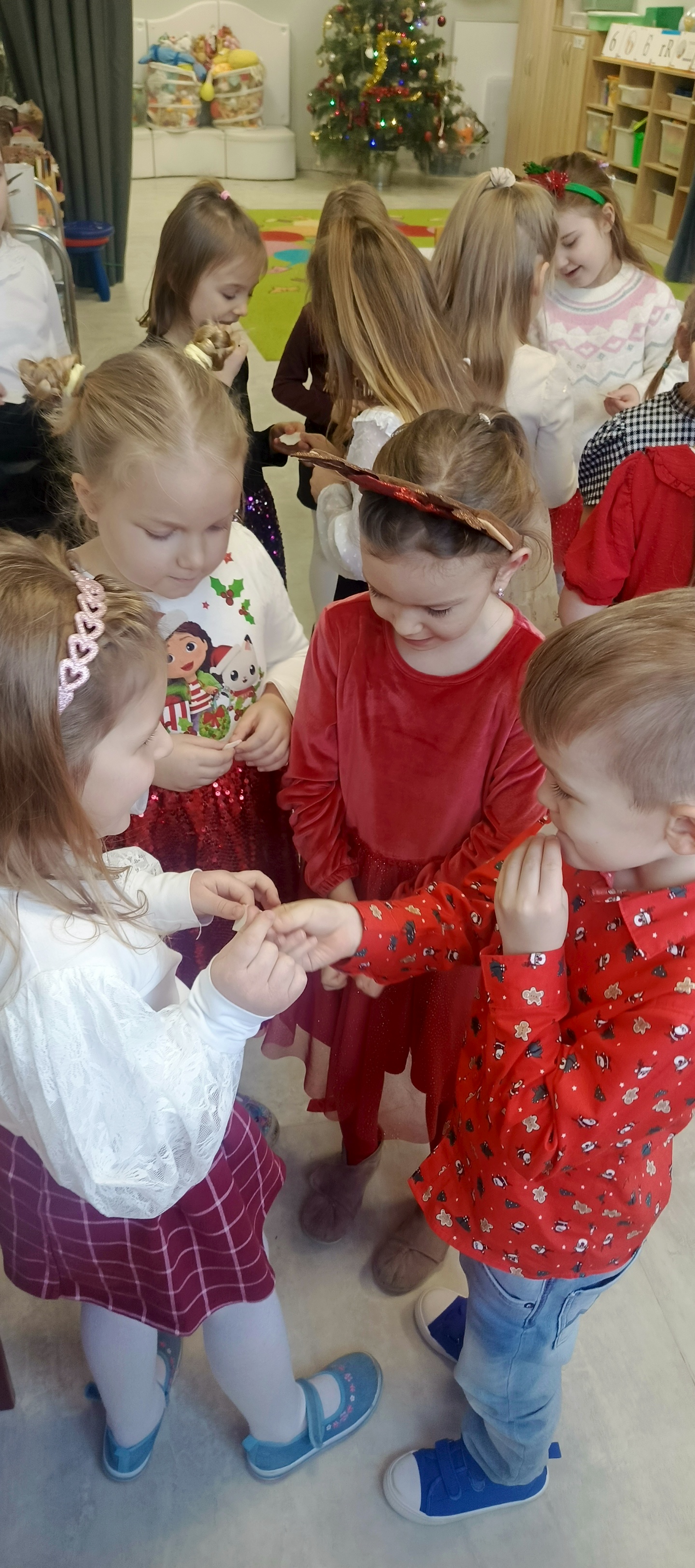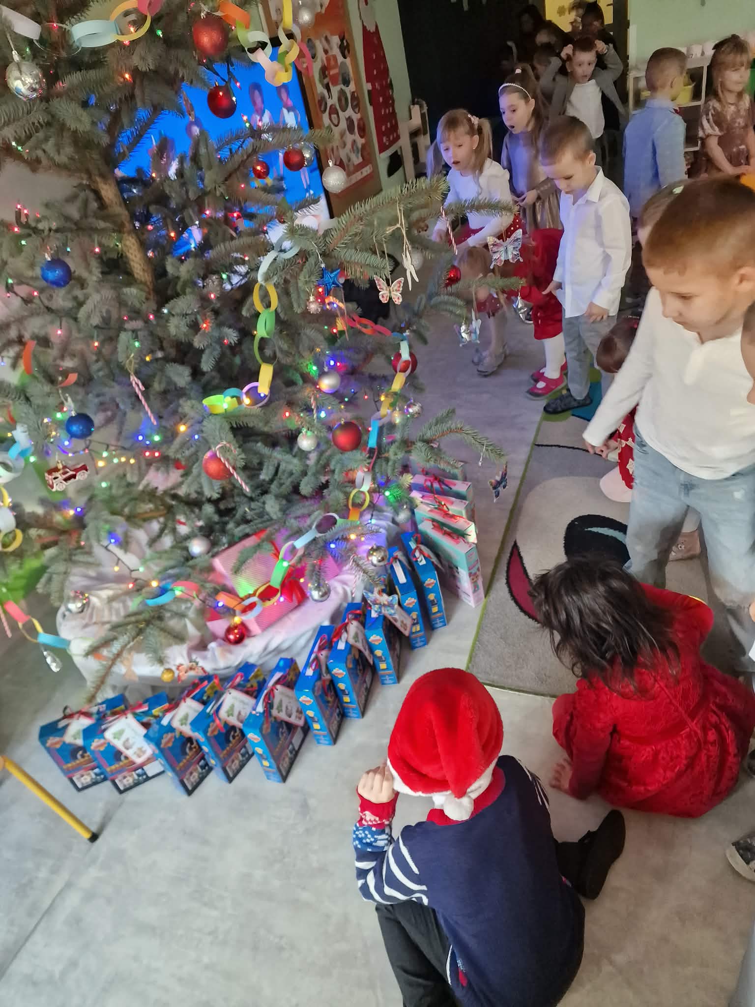 W piatek 19 grudnia naszym przedszkolu odbyła się uroczysta Wigilia przedszkolna połączona z kolędowaniem. W ciepłej, świątecznej atmosferze dzieci wspólnie dzieliły się opłatkiem i śpiewały kolędy. Wyjątkowym gościem był leśniczy Pan Adam Cymerys, który akompaniował na gitarze, wprowadzając wszystkich w radosny, bożonarodzeniowy nastrój. Był to piękny czas pełen uśmiechu, muzyki i świątecznej bliskości.