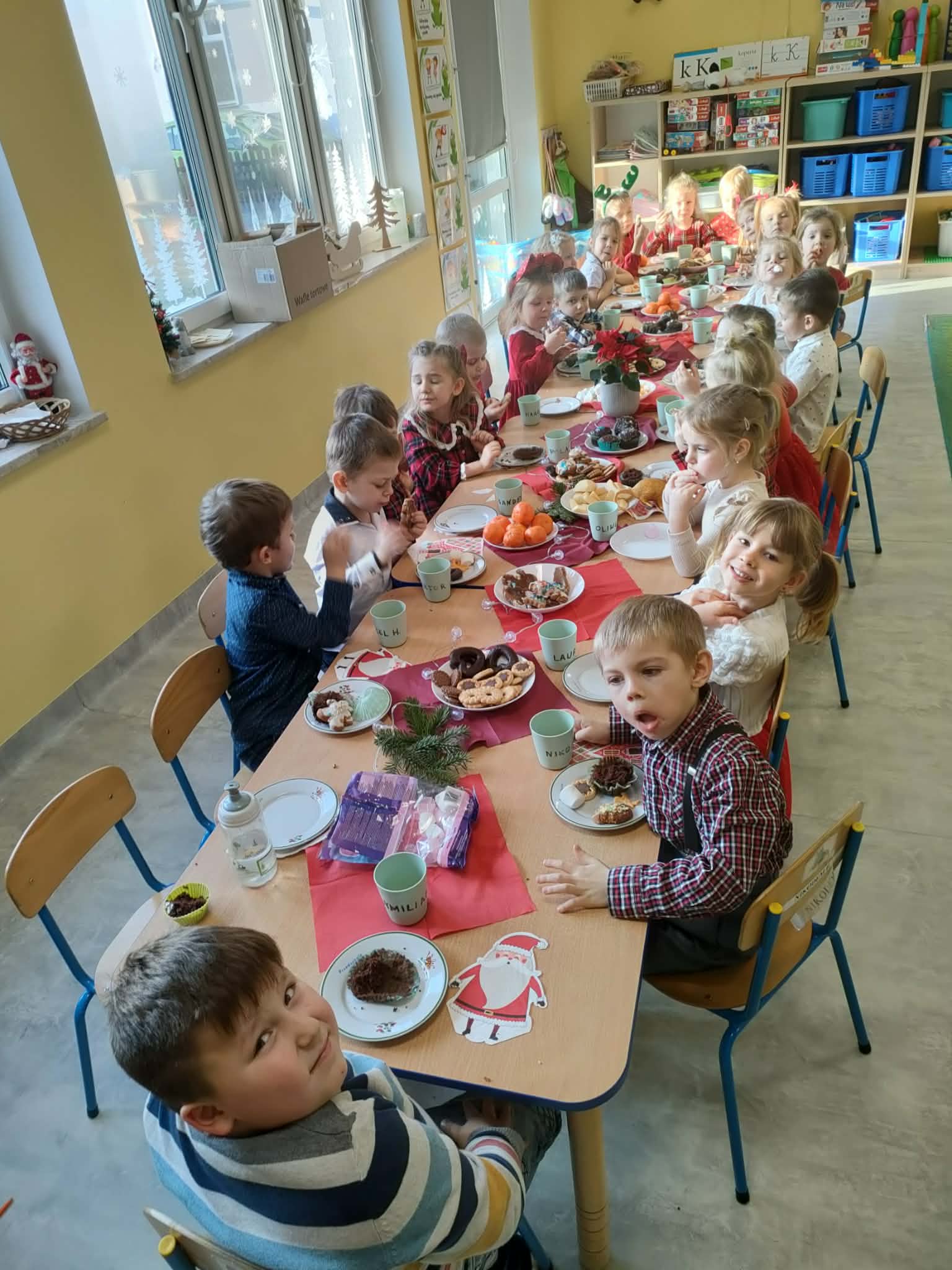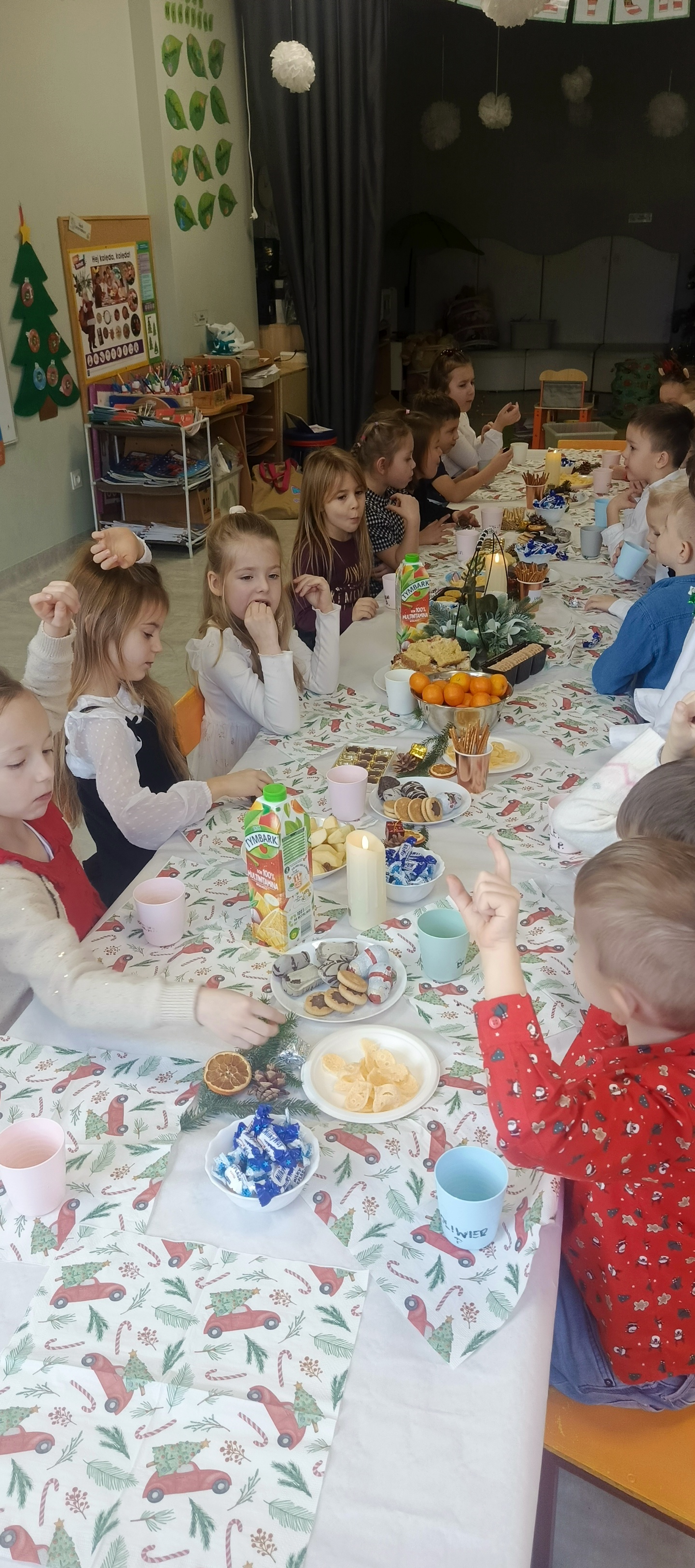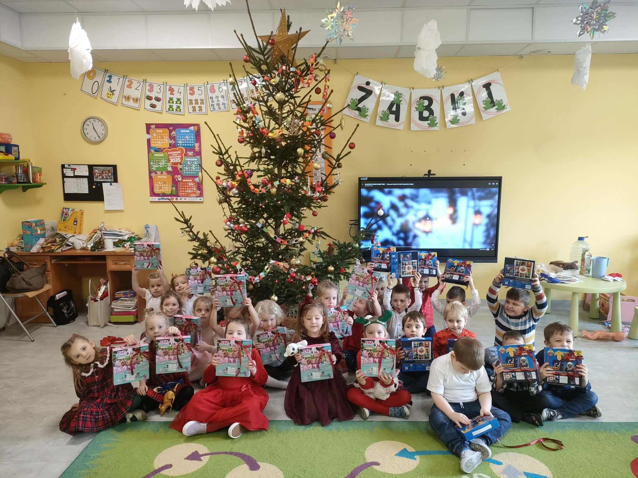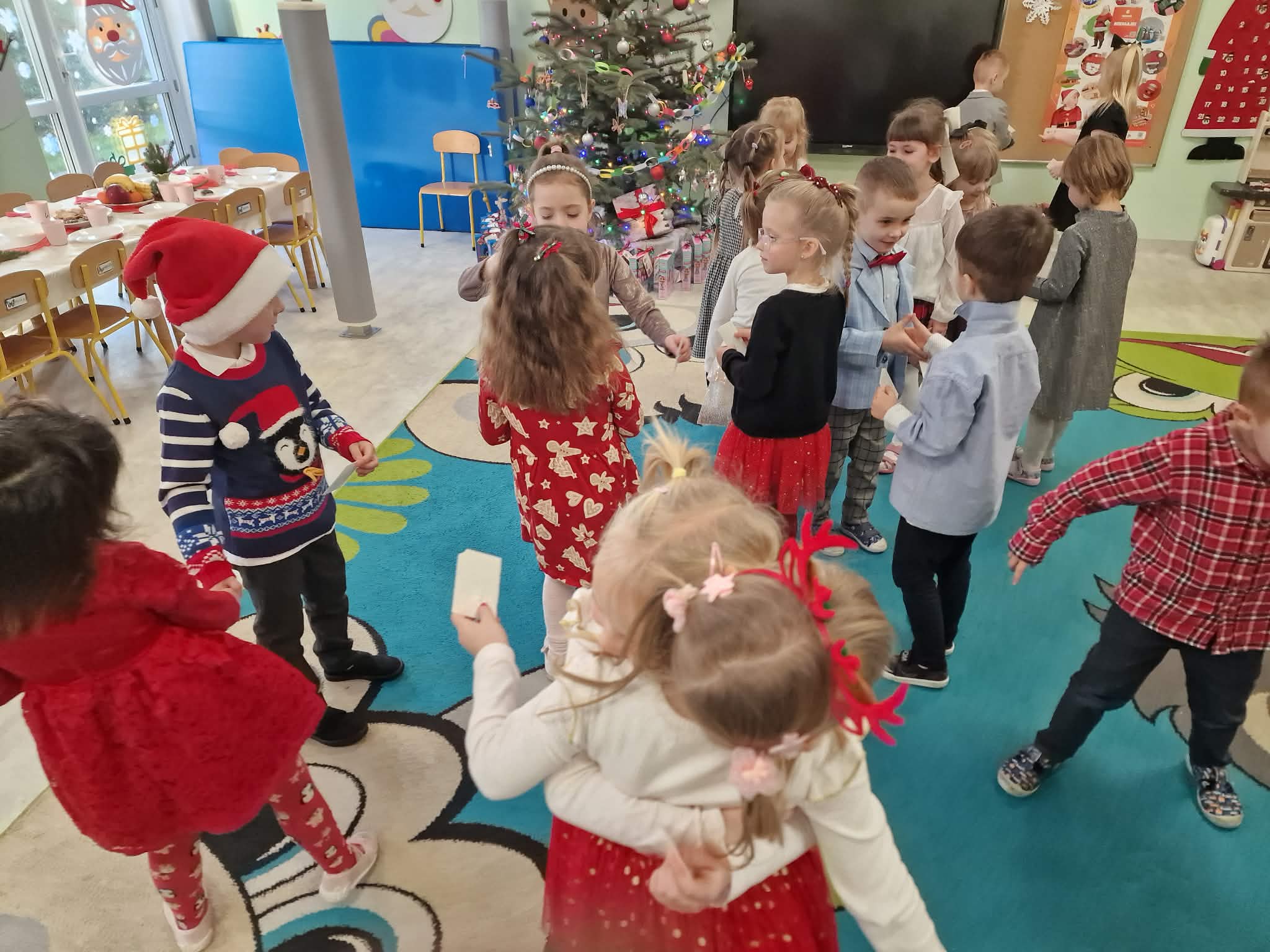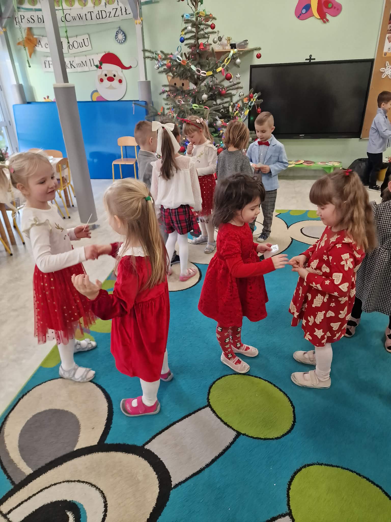W piatek 19 grudnia naszym przedszkolu odbyła się uroczysta Wigilia przedszkolna połączona z kolędowaniem. W ciepłej, świątecznej atmosferze dzieci wspólnie dzieliły się opłatkiem i śpiewały kolędy. Wyjątkowym gościem był leśniczy Pan Adam Cymerys, który akompaniował na gitarze, wprowadzając wszystkich w radosny, bożonarodzeniowy nastrój. Był to piękny czas pełen uśmiechu, muzyki i świątecznej bliskości.