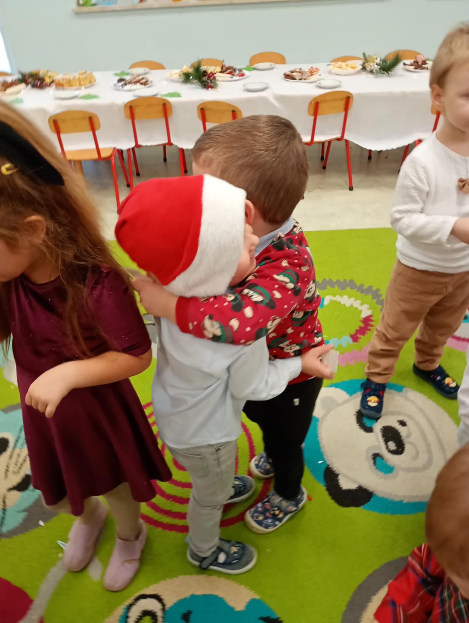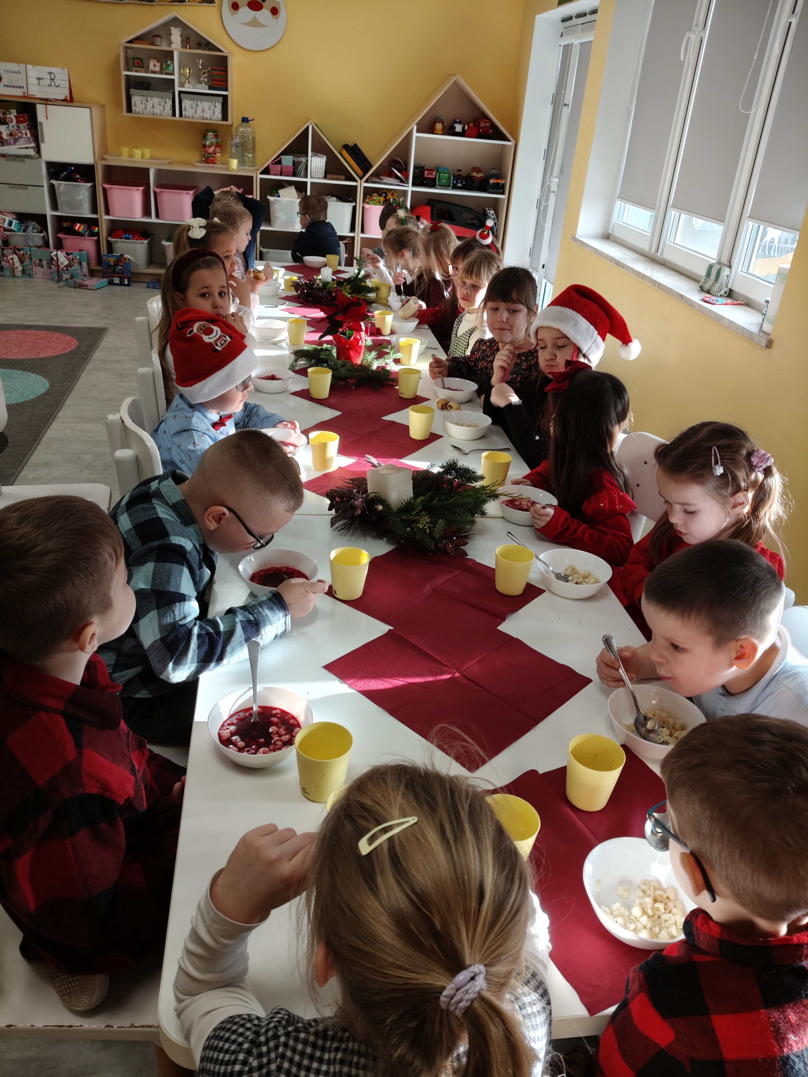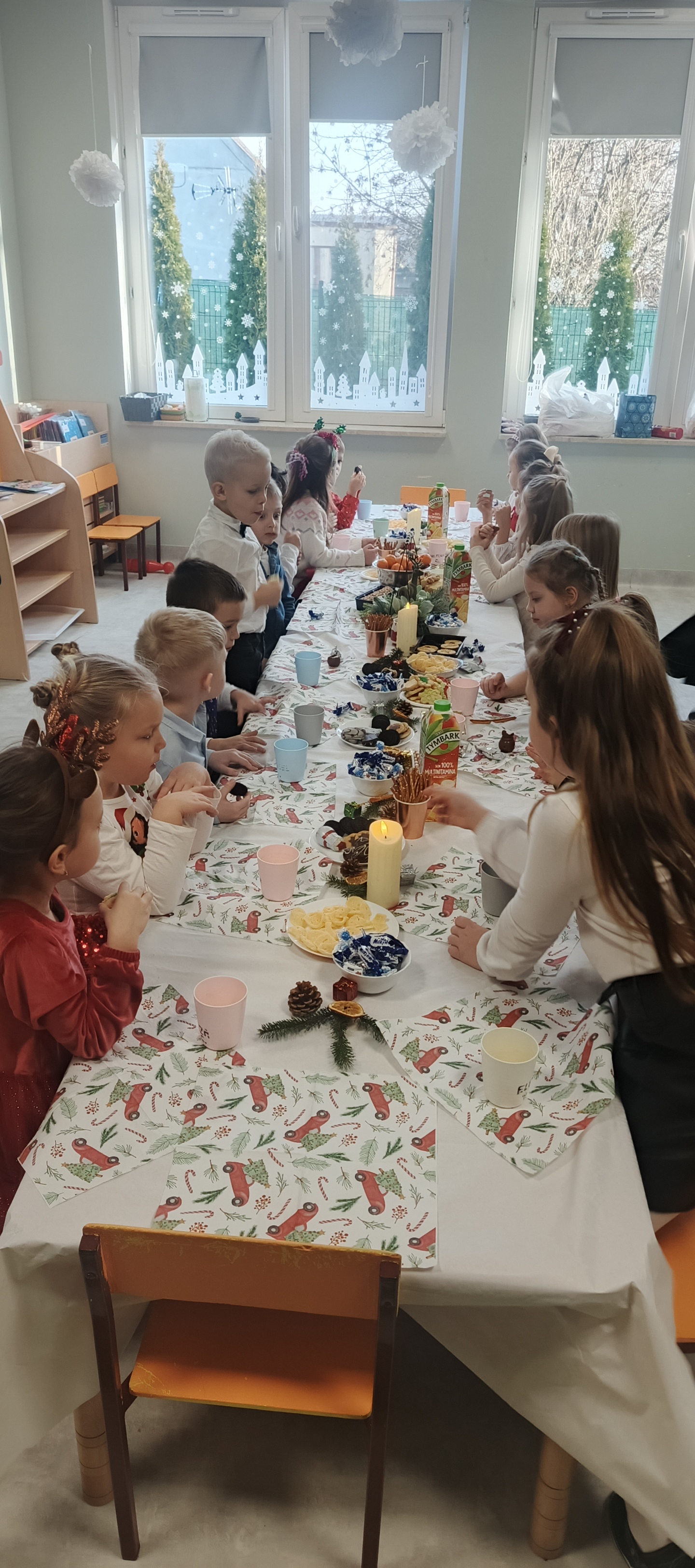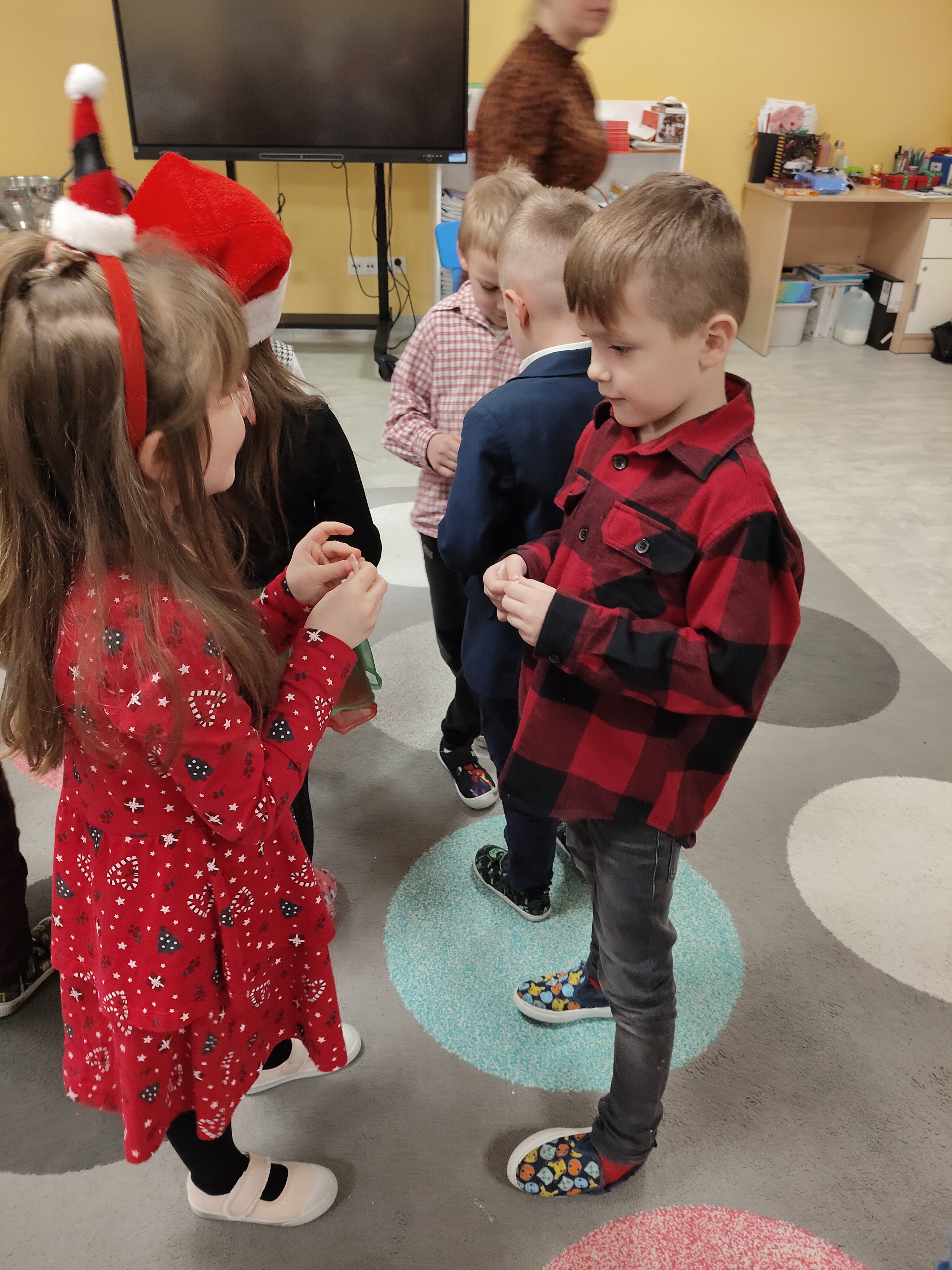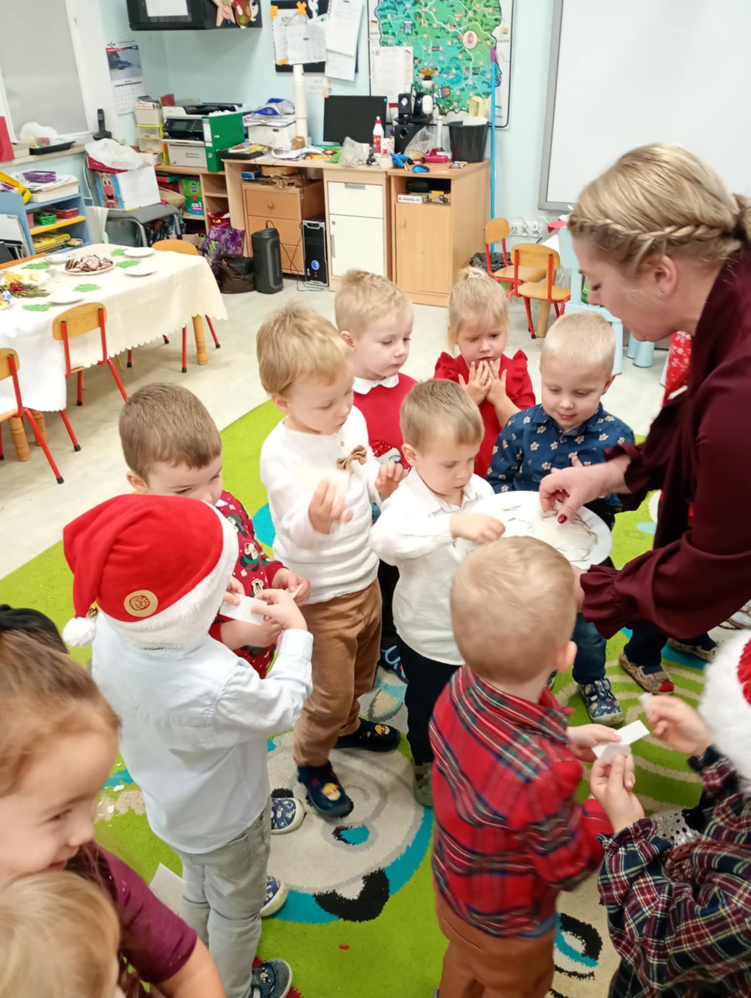 W piatek 19 grudnia naszym przedszkolu odbyła się uroczysta Wigilia przedszkolna połączona z kolędowaniem. W ciepłej, świątecznej atmosferze dzieci wspólnie dzieliły się opłatkiem i śpiewały kolędy. Wyjątkowym gościem był leśniczy Pan Adam Cymerys, który akompaniował na gitarze, wprowadzając wszystkich w radosny, bożonarodzeniowy nastrój. Był to piękny czas pełen uśmiechu, muzyki i świątecznej bliskości.