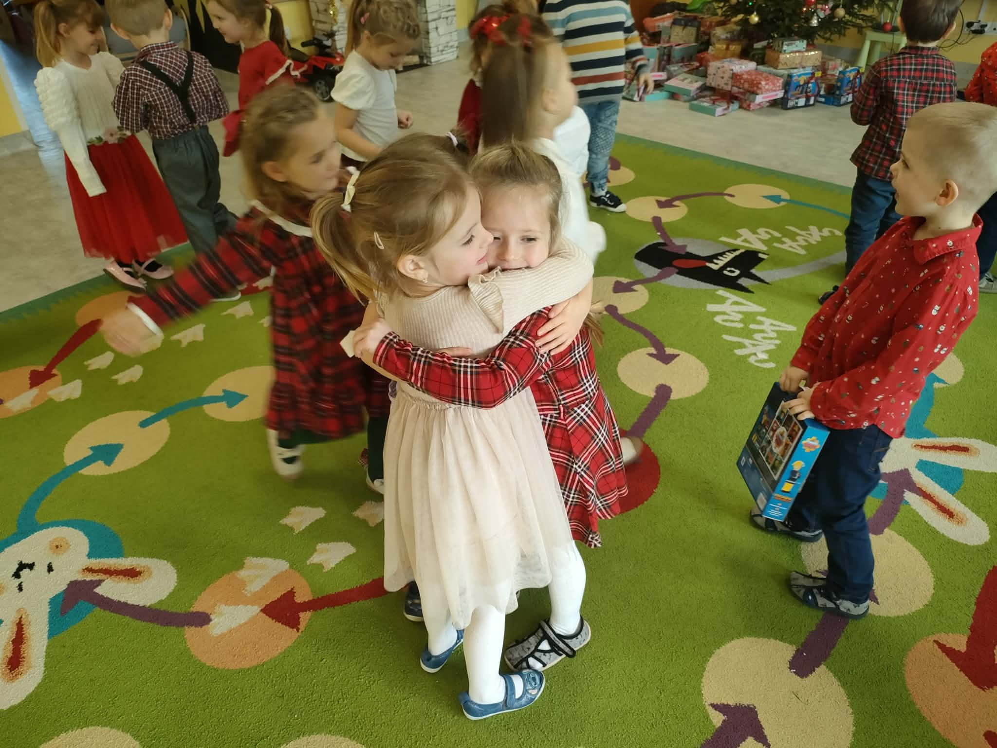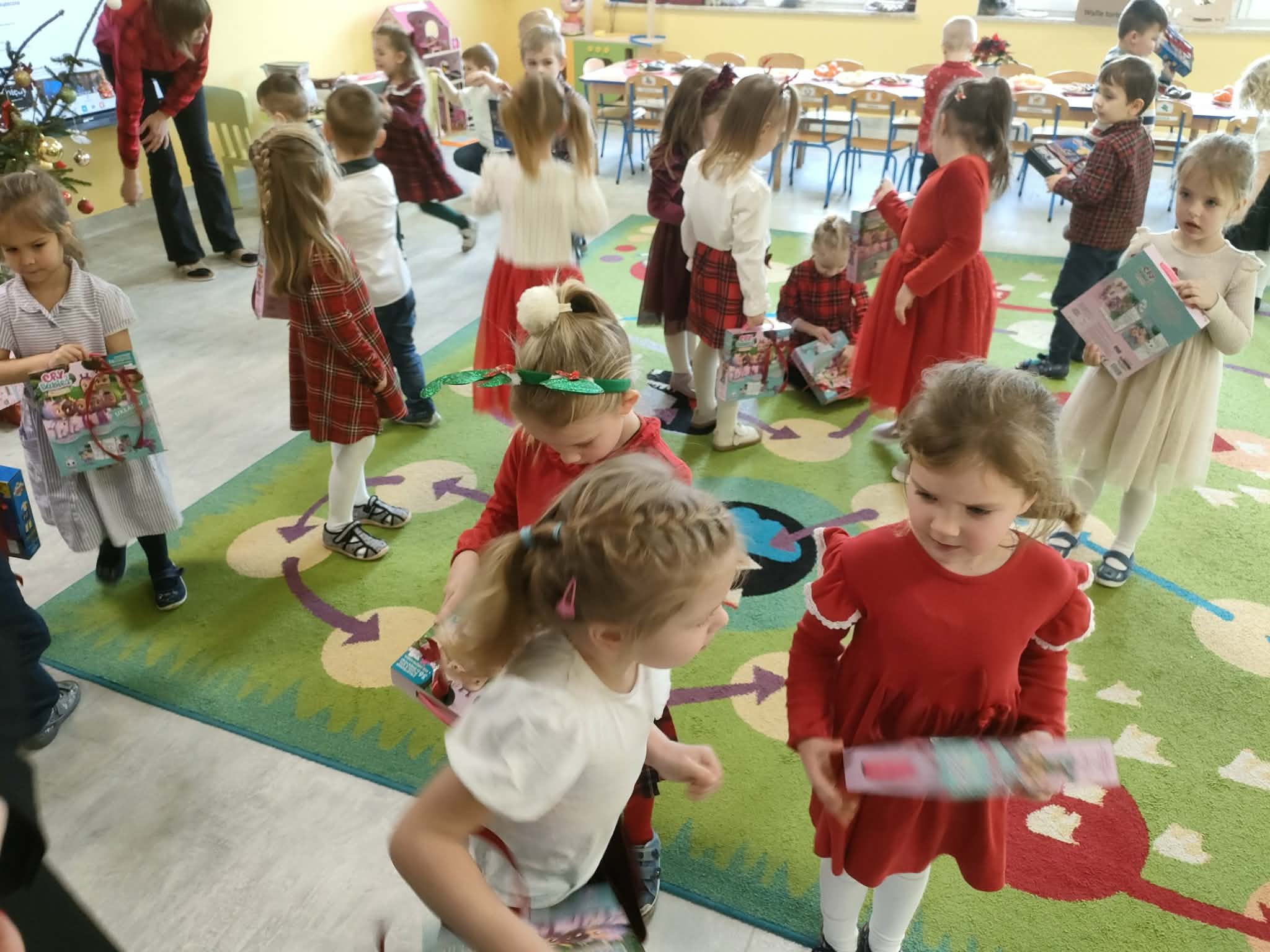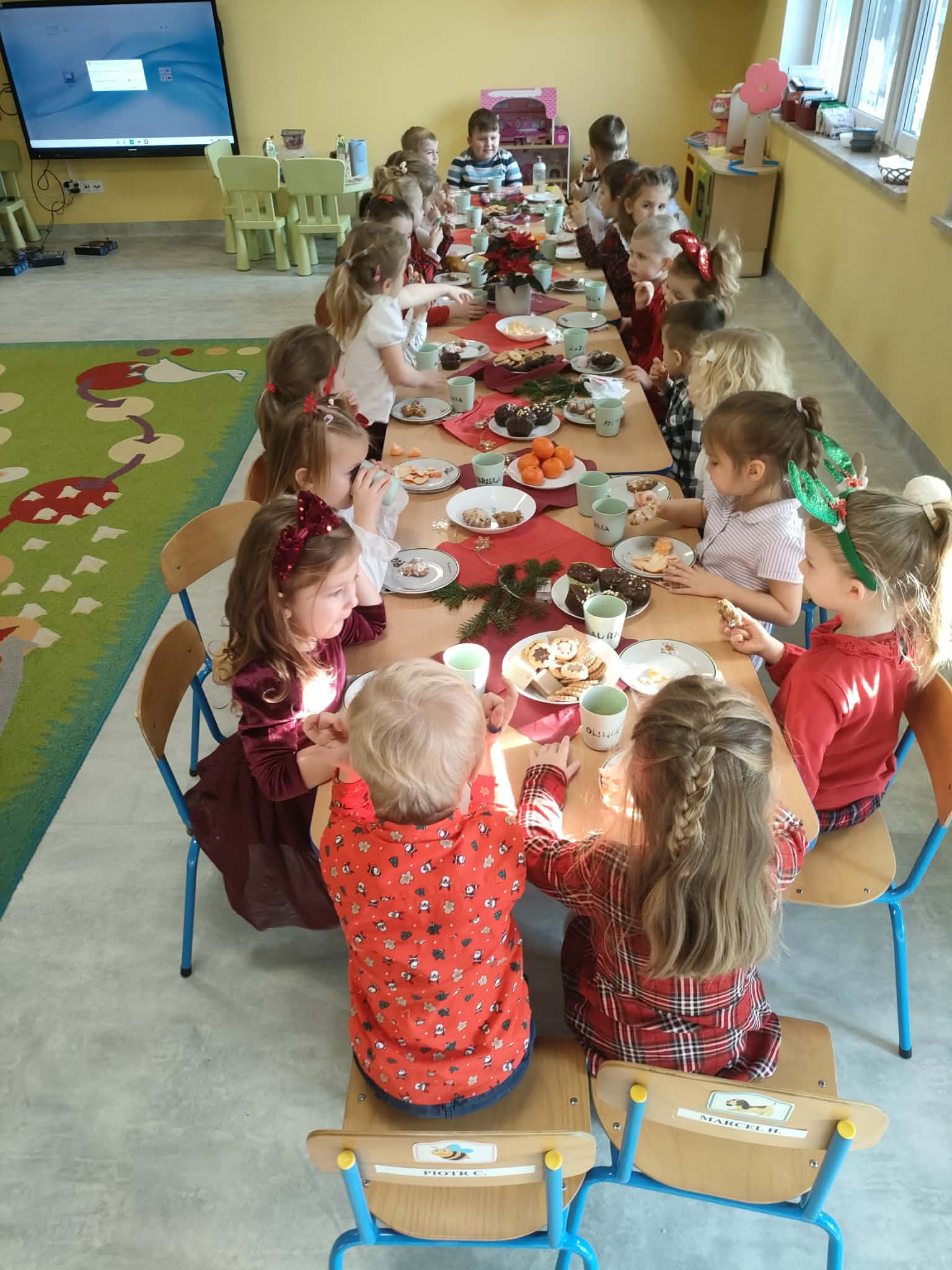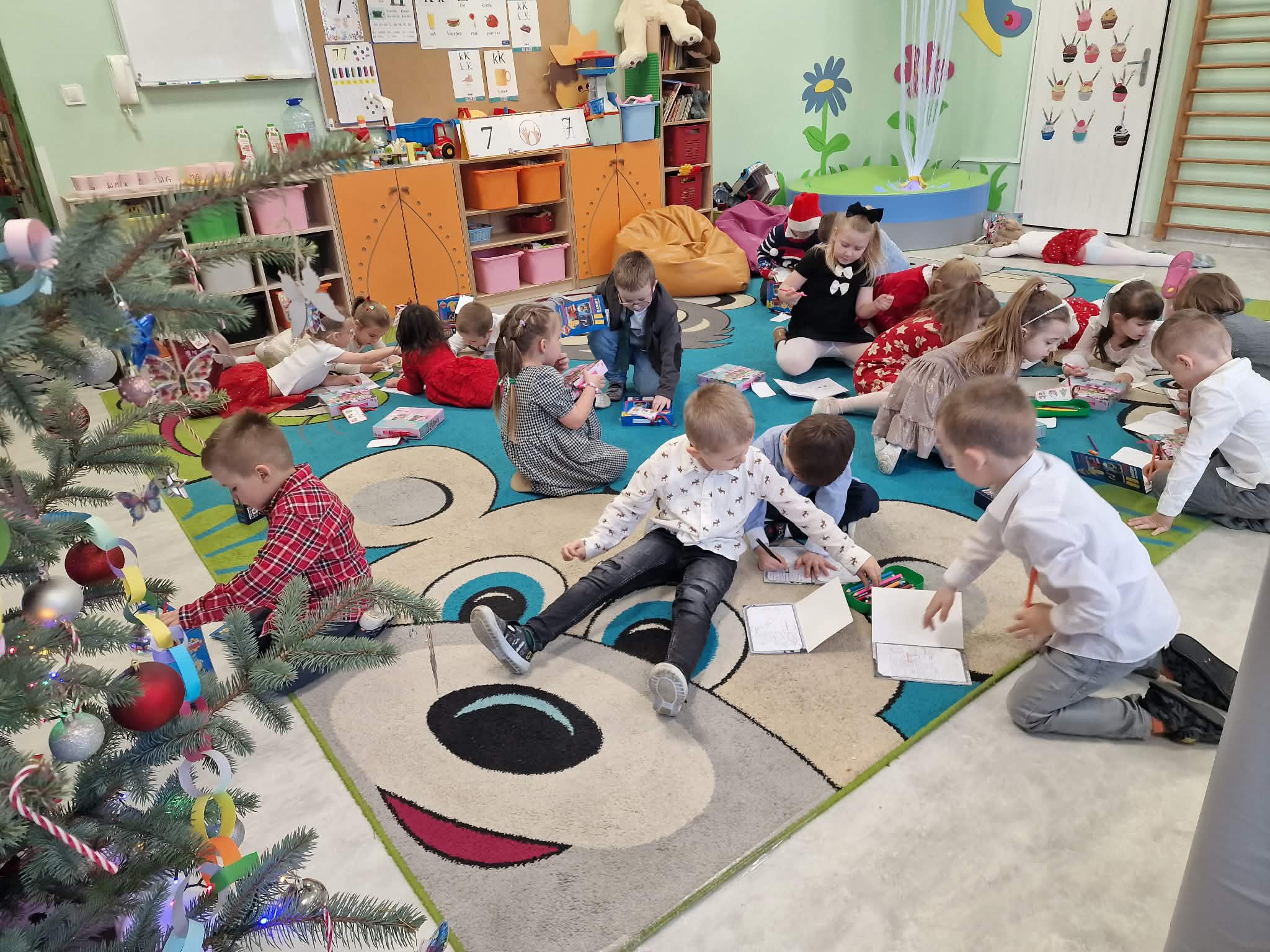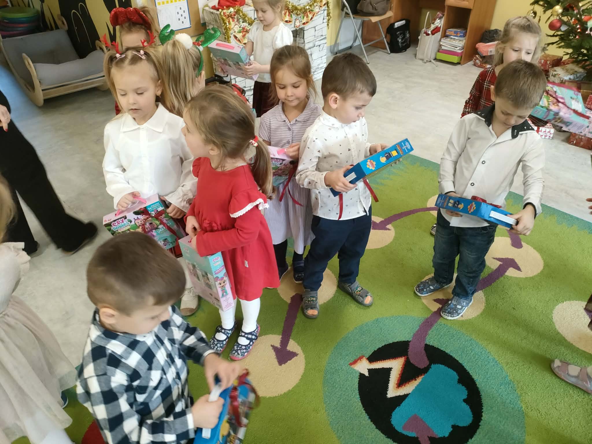 W piatek 19 grudnia naszym przedszkolu odbyła się uroczysta Wigilia przedszkolna połączona z kolędowaniem. W ciepłej, świątecznej atmosferze dzieci wspólnie dzieliły się opłatkiem i śpiewały kolędy. Wyjątkowym gościem był leśniczy Pan Adam Cymerys, który akompaniował na gitarze, wprowadzając wszystkich w radosny, bożonarodzeniowy nastrój. Był to piękny czas pełen uśmiechu, muzyki i świątecznej bliskości.