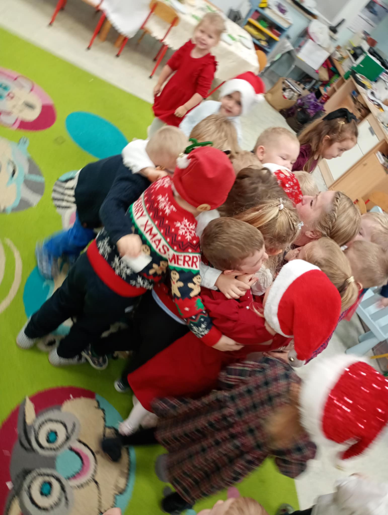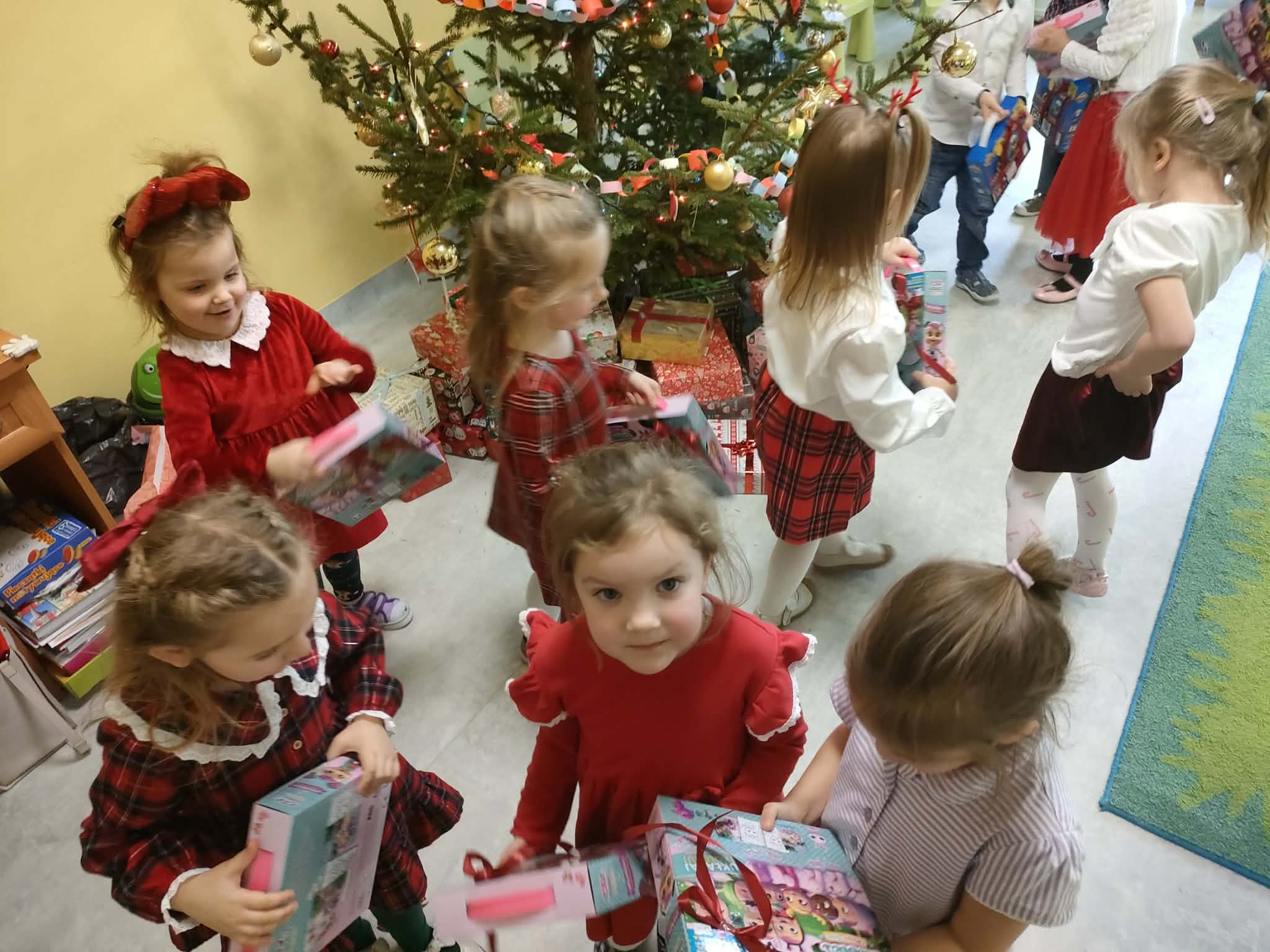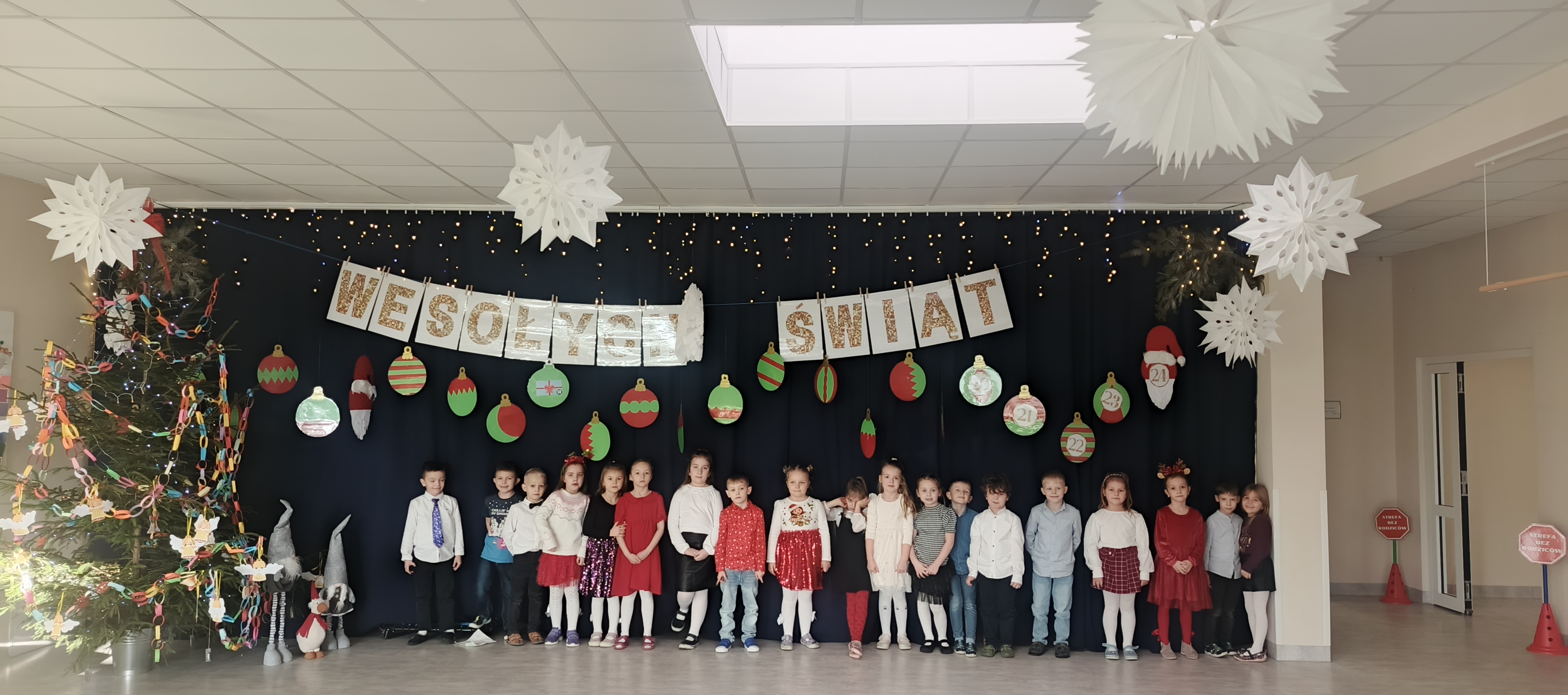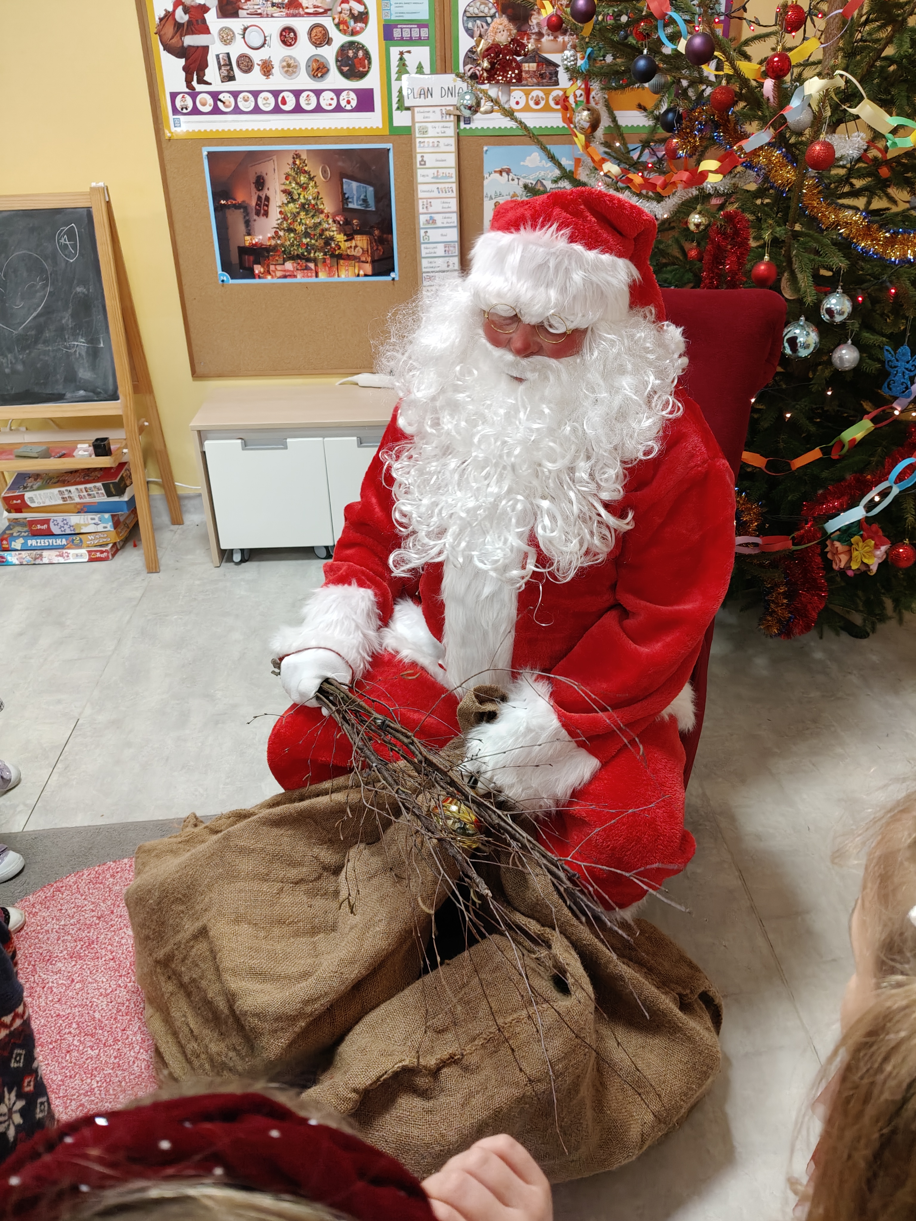 W piatek 19 grudnia naszym przedszkolu odbyła się uroczysta Wigilia przedszkolna połączona z kolędowaniem. W ciepłej, świątecznej atmosferze dzieci wspólnie dzieliły się opłatkiem i śpiewały kolędy. Wyjątkowym gościem był leśniczy Pan Adam Cymerys, który akompaniował na gitarze, wprowadzając wszystkich w radosny, bożonarodzeniowy nastrój. Był to piękny czas pełen uśmiechu, muzyki i świątecznej bliskości.