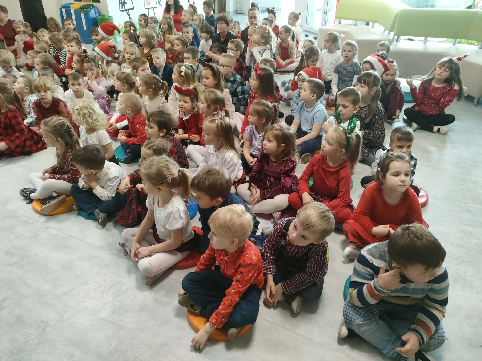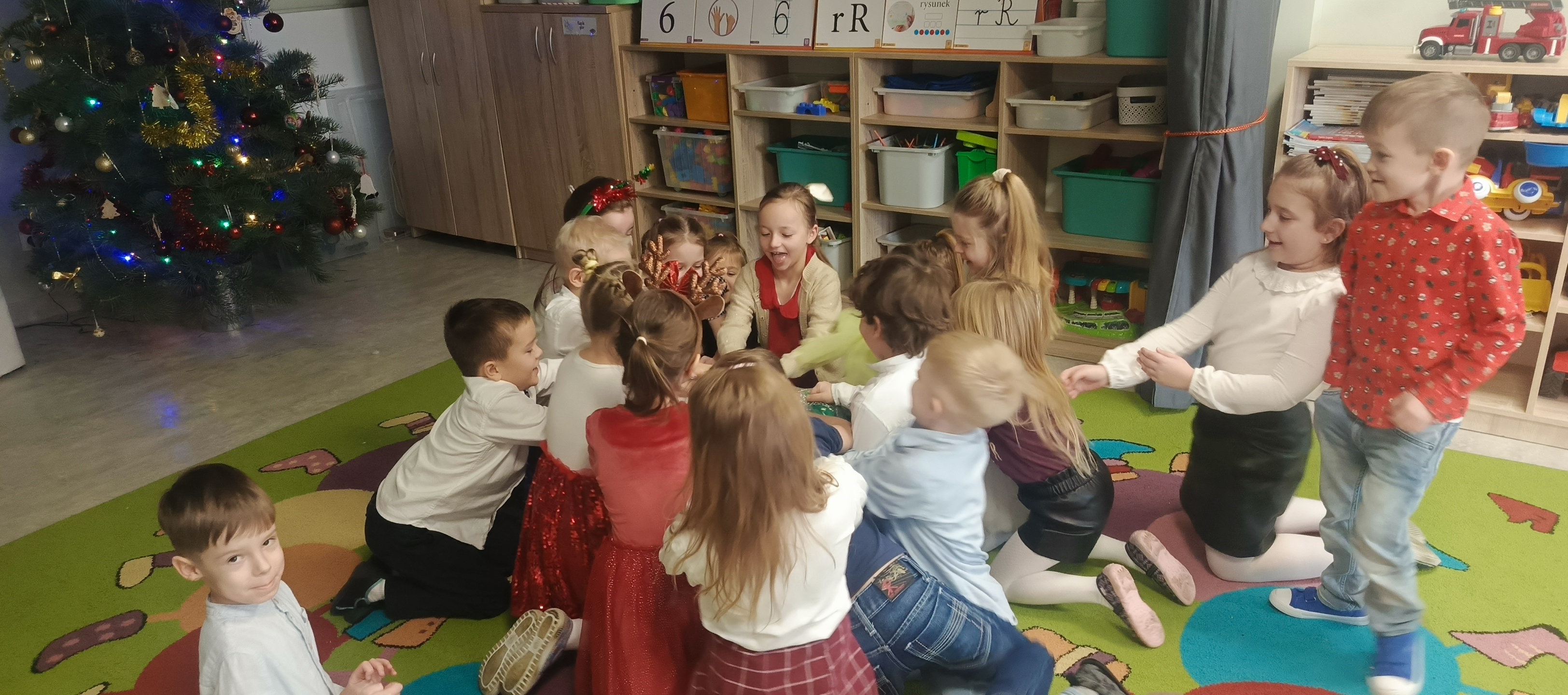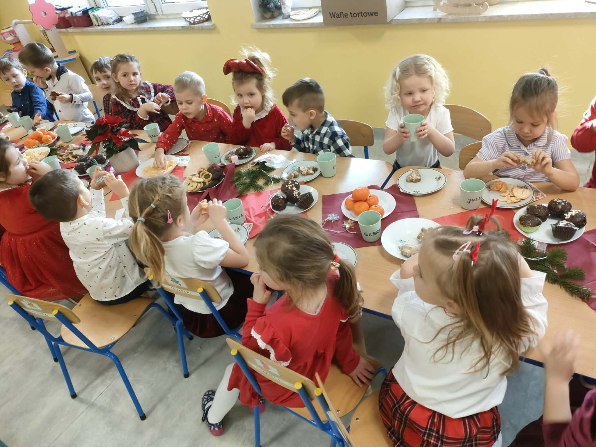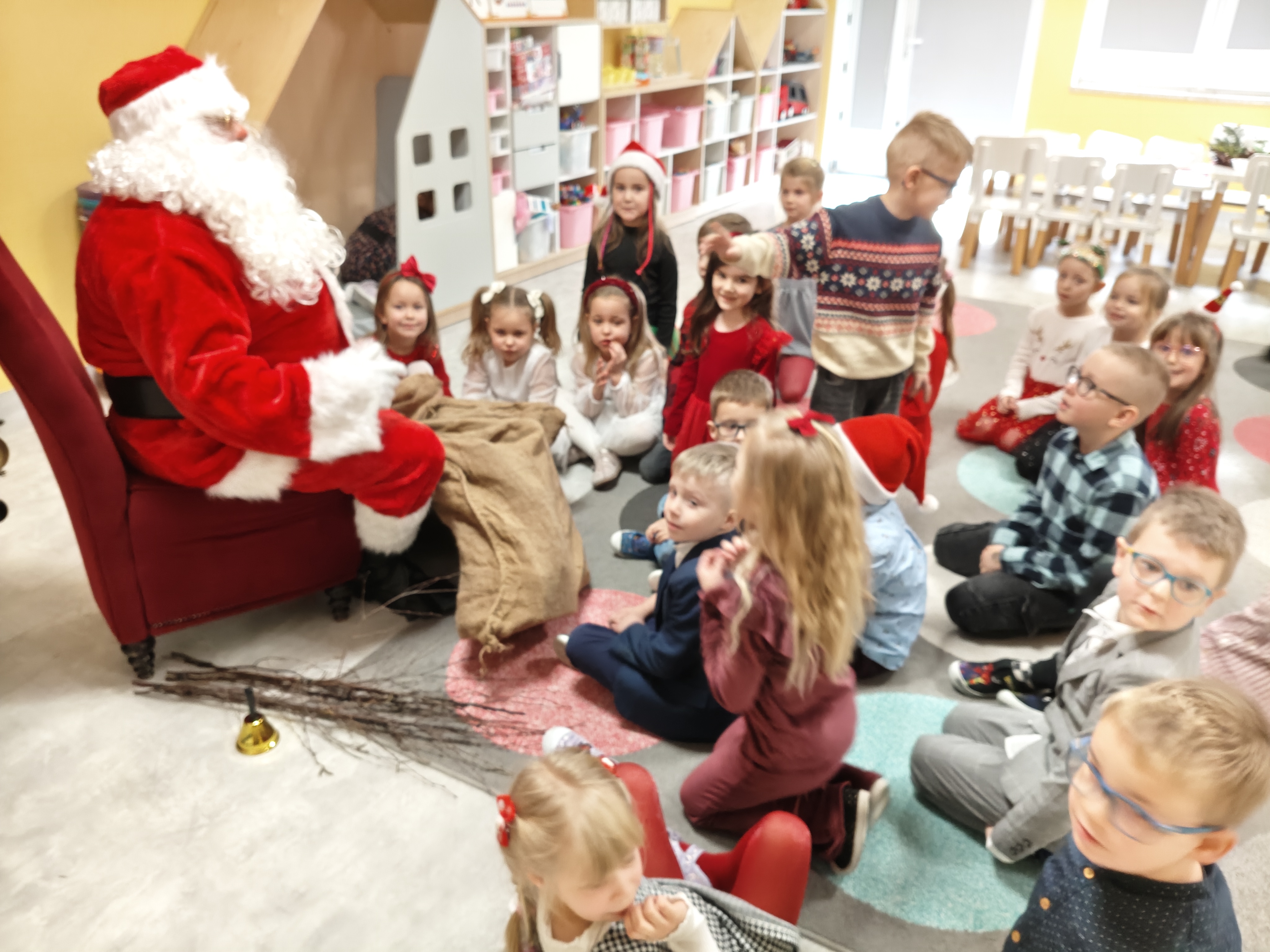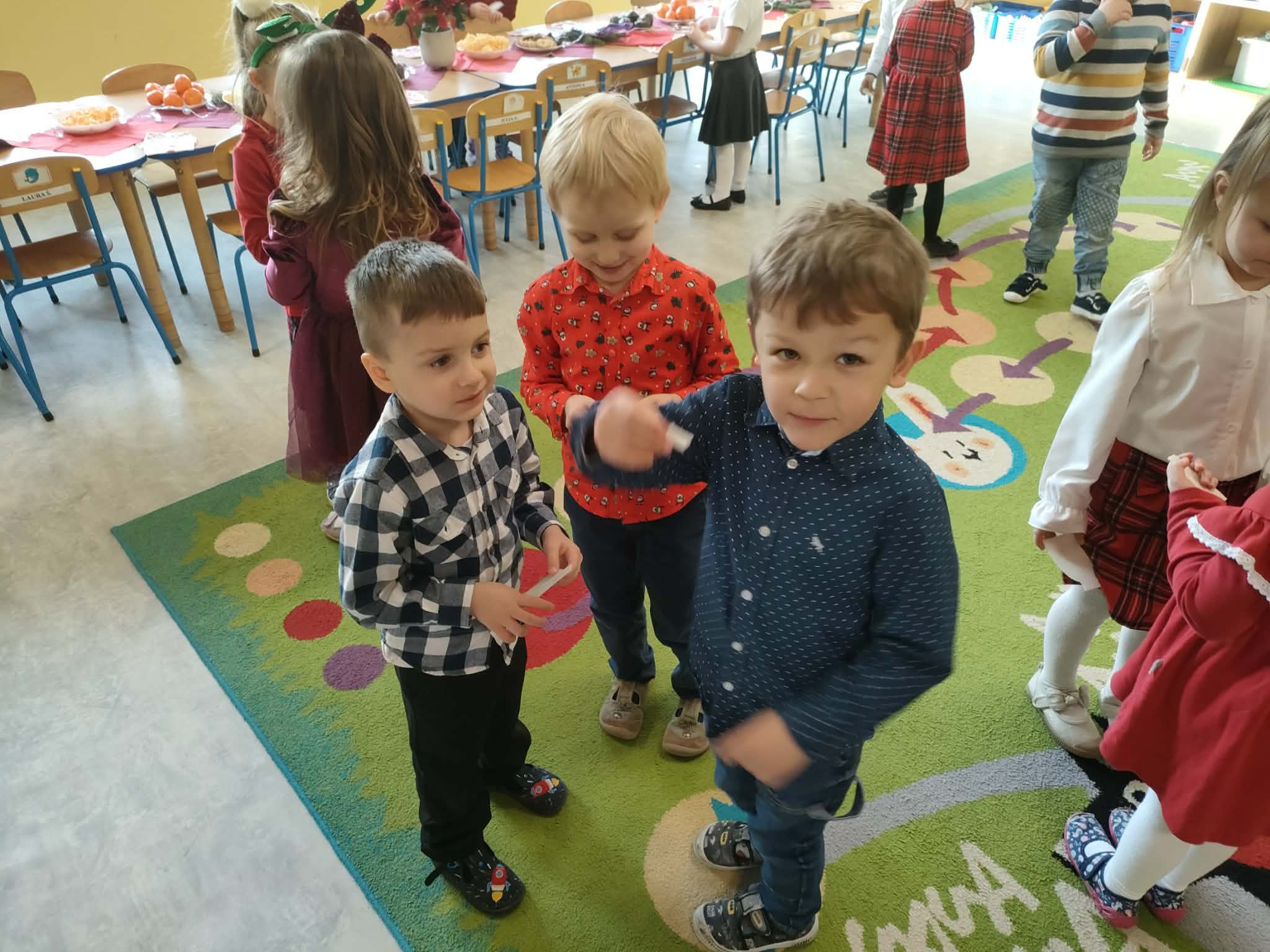 W piatek 19 grudnia naszym przedszkolu odbyła się uroczysta Wigilia przedszkolna połączona z kolędowaniem. W ciepłej, świątecznej atmosferze dzieci wspólnie dzieliły się opłatkiem i śpiewały kolędy. Wyjątkowym gościem był leśniczy Pan Adam Cymerys, który akompaniował na gitarze, wprowadzając wszystkich w radosny, bożonarodzeniowy nastrój. Był to piękny czas pełen uśmiechu, muzyki i świątecznej bliskości.